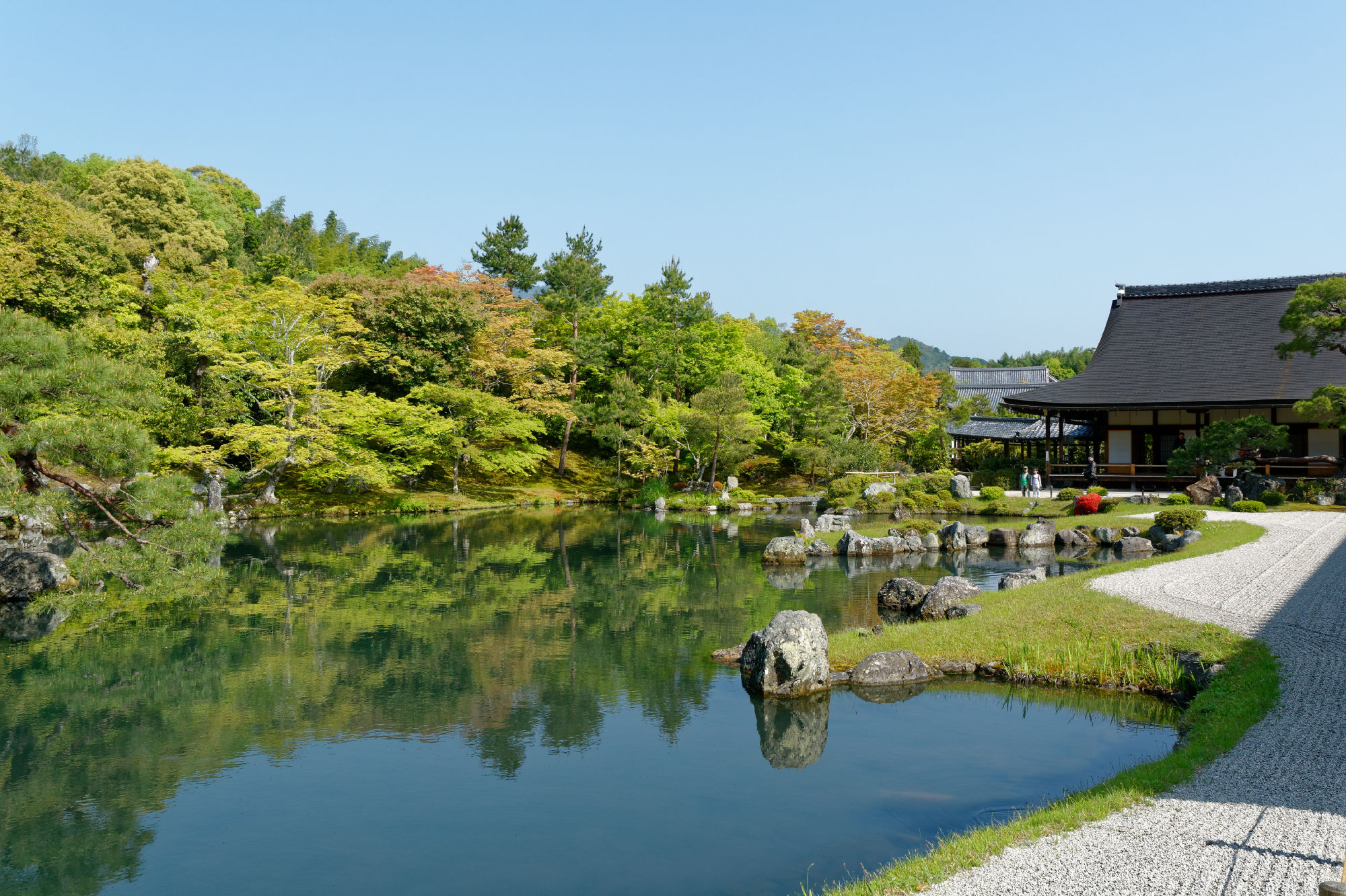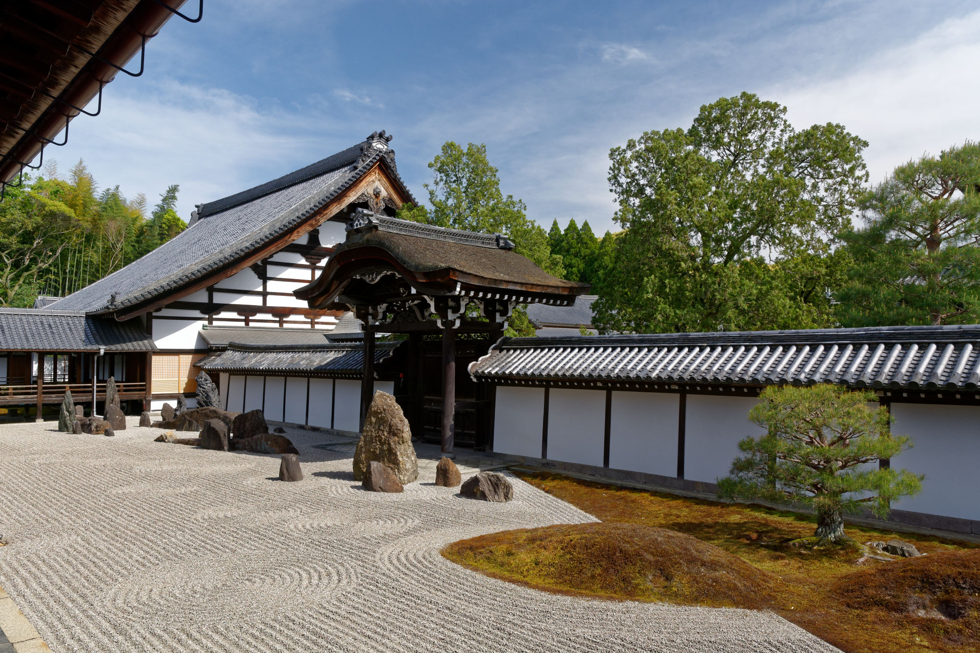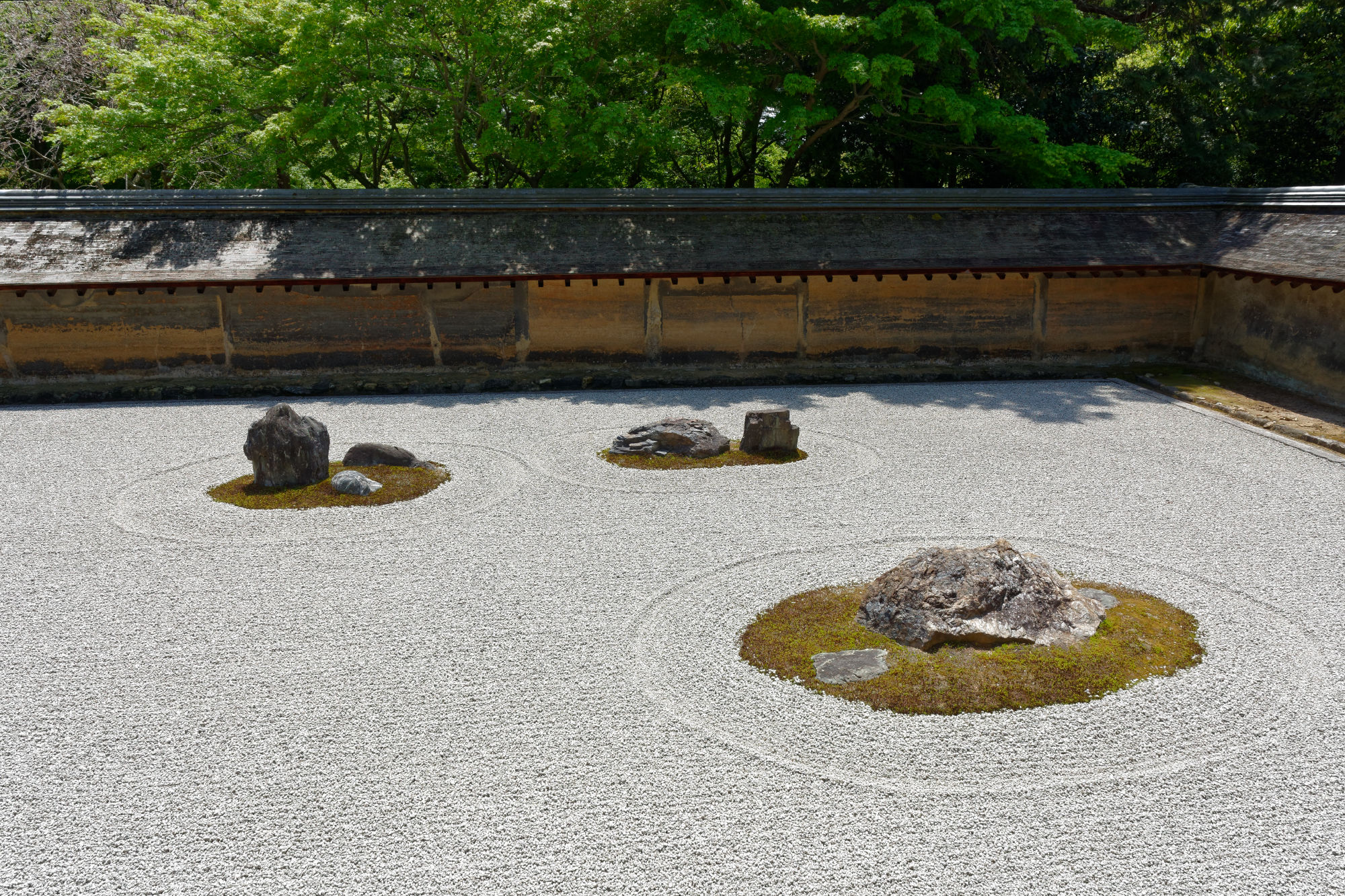 In Kyotos berühmtem Zengarten Ryoanji unternimmt man, mit den Augen und dem Geist, denn dieser Garten darf nicht betreten werden, eine Reise zu den Inseln der Seligen. Er wurde um 1500, gegen Ende der Muromachi-Periode, von einem unbekannten Mönch entworfen und zeichnet sich durch seine besonders schlichte Anlage aus: eine Kiesfläche, auf der scheinbar willkürlich einige größere Steine verteilt sind. Obwohl wenig zu sehen ist, besitzt er eine herausragende Ausstrahlung. Ein schmales Rechteck, drei Seiten sind von einer mannshohen Mauer umgeben. Die Fläche ist mit weißem Kies bedeckt und zu einem eleganten Muster geharkt. Darauf erheben sich die Steine, umrahmt von einem schmalen Streifen Moos. Die Steine bilden eine Konstellation, die absichtslos wirkt, spontan, zufällig und damit im Grunde die künstlerischen Neuerungen der Moderne vorwegnimmt. Sie sind weder bizarr geformt noch überwältigend groß, allenfalls hüfthoch. Einzelne stehen aufrecht, einige liegen flach und ragen nur knapp über den Kies hinaus. Graue, normale Steine, zu zweit oder dritt gruppiert, dazwischen Leere und Kies. Der zweite Zengarten, den wir besucht haben, liegt in Kyotos Tofukuji Tempel.