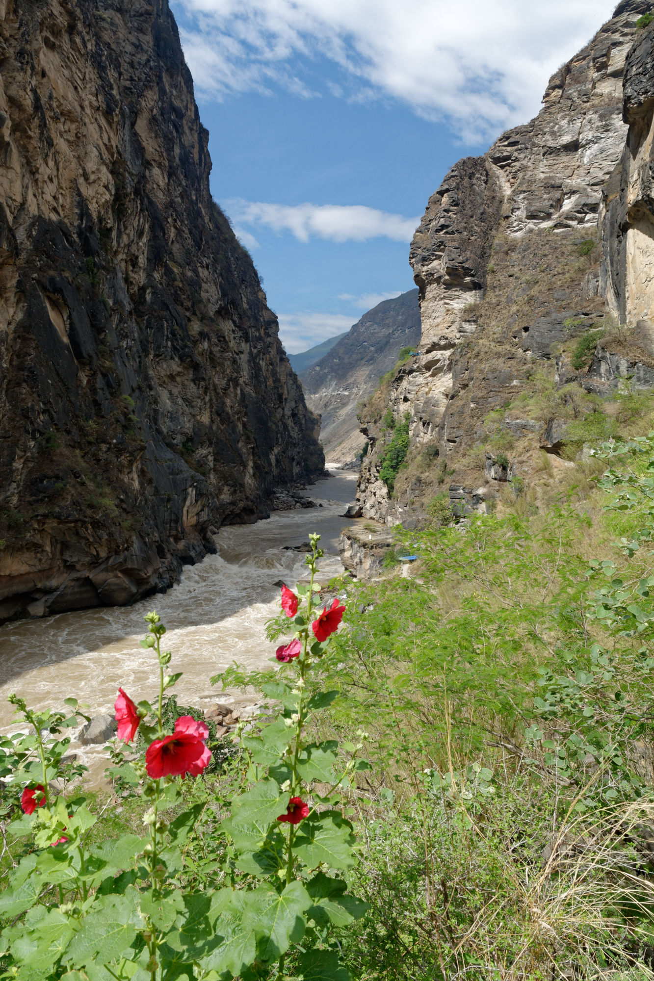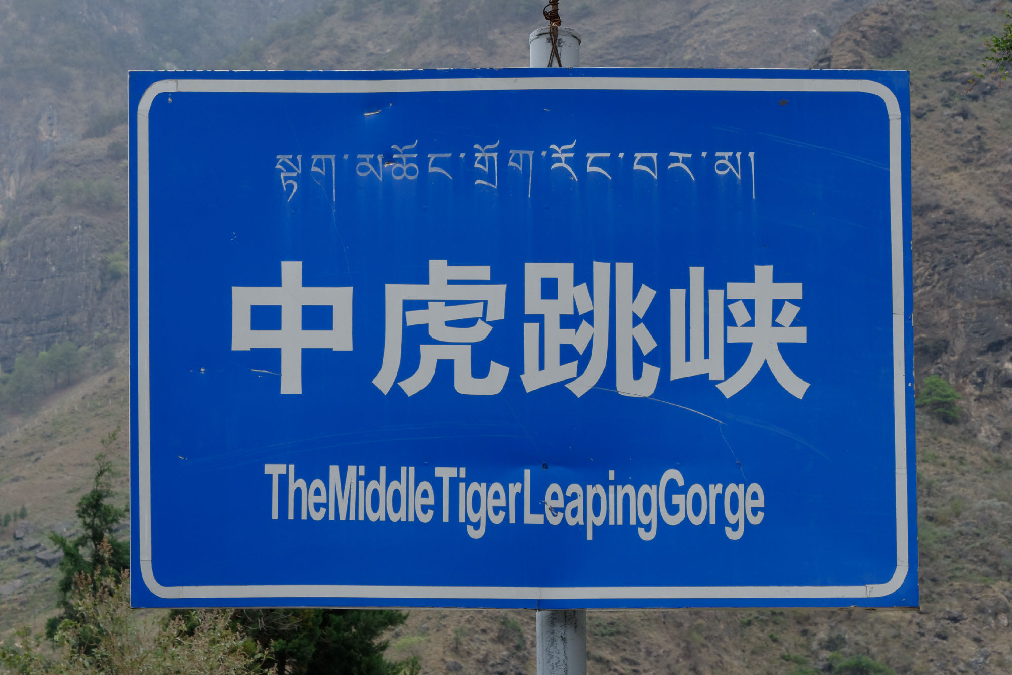 Im Süden des tibetanischen Hochgebirges hat sich der noch junge Jangtse Fluss, der tausende von Kilometer später bei Shanghai in das Chinesische Meer mündet, eine tiefe Schlucht gefräst. 3900 vertikale Meter sind es vom Wasserlauf bis zum Gipfel des nahen Haba Gebirges. Der Legende nach hat ein Tiger die Schlucht an ihrer engsten Stelle über einen Felsblock in der Flussmitte mit zwei Sprüngen überwunden.