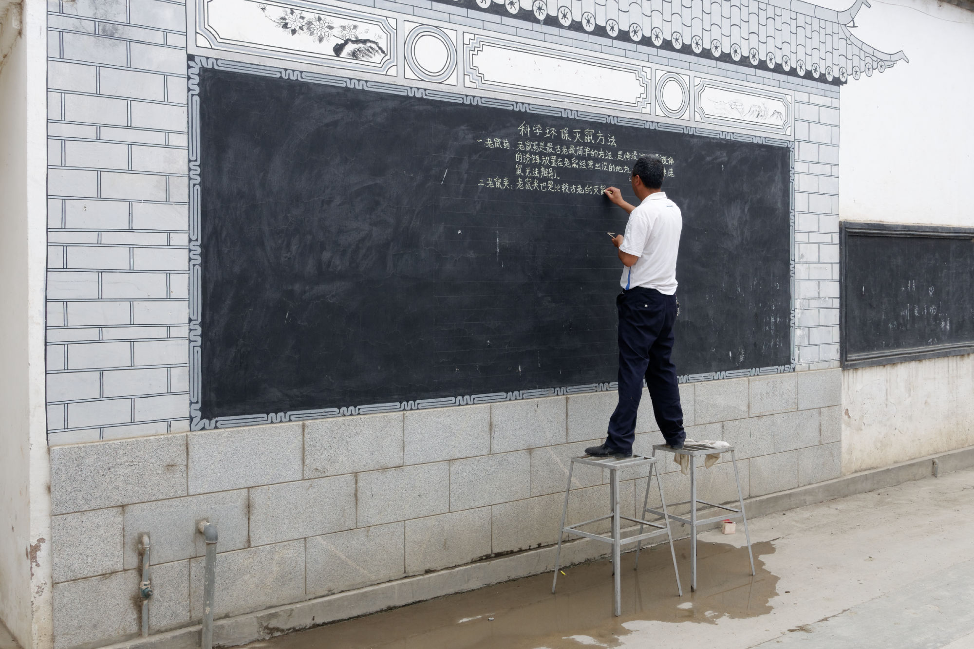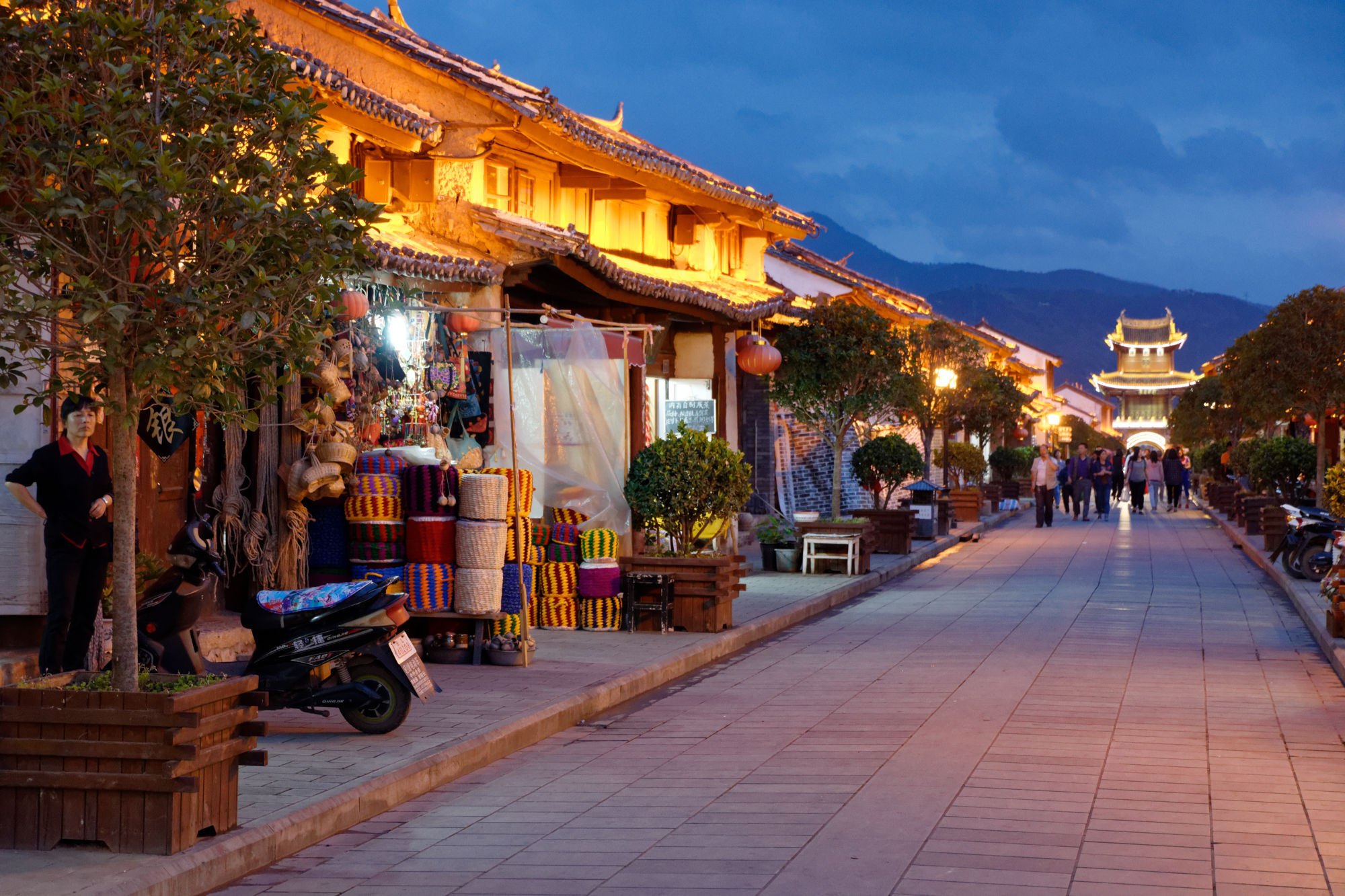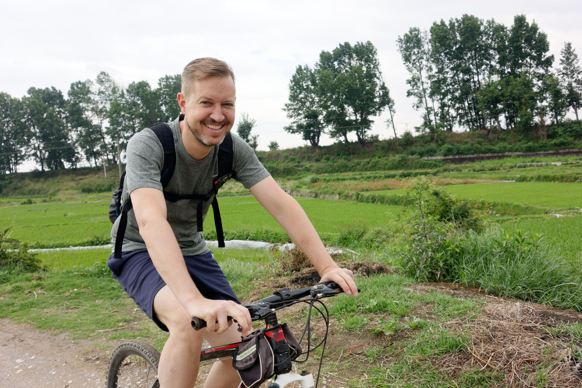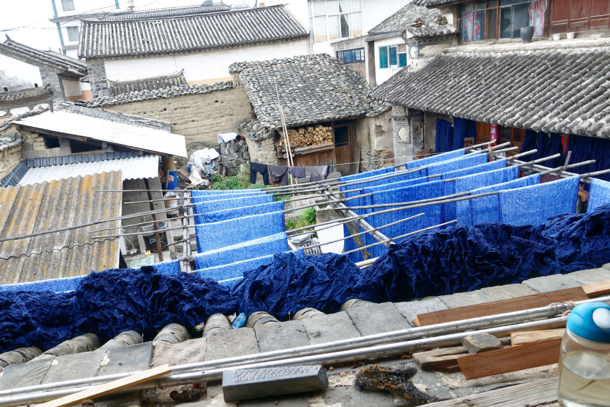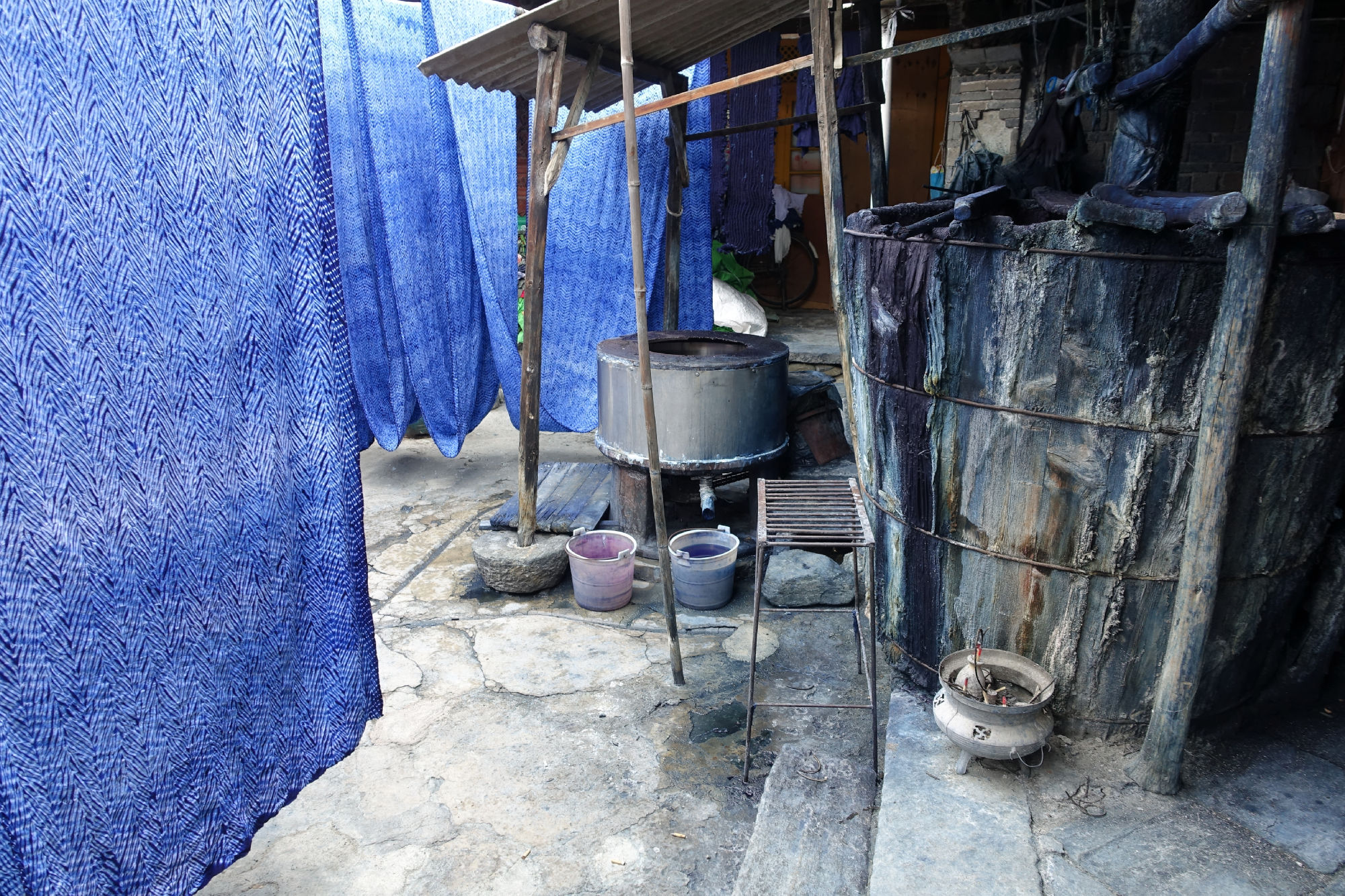Anderntags streiften wir über den lokalen Markt (wieder mal), amüsierten uns, dass die Chinesen vor jedem Fenster, jedem Shop und jeder Blume für ein Foto posieren, beobachteten, wie die Quartiernews mit Kreide auf die Wand geschrieben werden und fuhren mit dem Bike über Reisfelder zum nächsten Dorf, das sich ganz auf die Indigo Färbung von Tücher spezialisiert hat. Da wurden wir unserem Vorsatz, nichts zu kaufen wieder mal untreu…. In einer Kaffeebar lernten wir den Besitzer Peter kennen, der uns wiederum mit grösster Sorgfalt gefilterten Kaffee zubereitete und auch über eine echte italienische Kolbenmaschine verfügte. Er notierte uns für die Reise zum nächsten Ort die Umsteigeverbindungen in chinesischer Sprache, so dass wir diese dem Taxifahrer und an der Busstation vorlegen konnten. Zudem gab er uns gleich die Adresse einer Kaffeebar in Weishan mit.