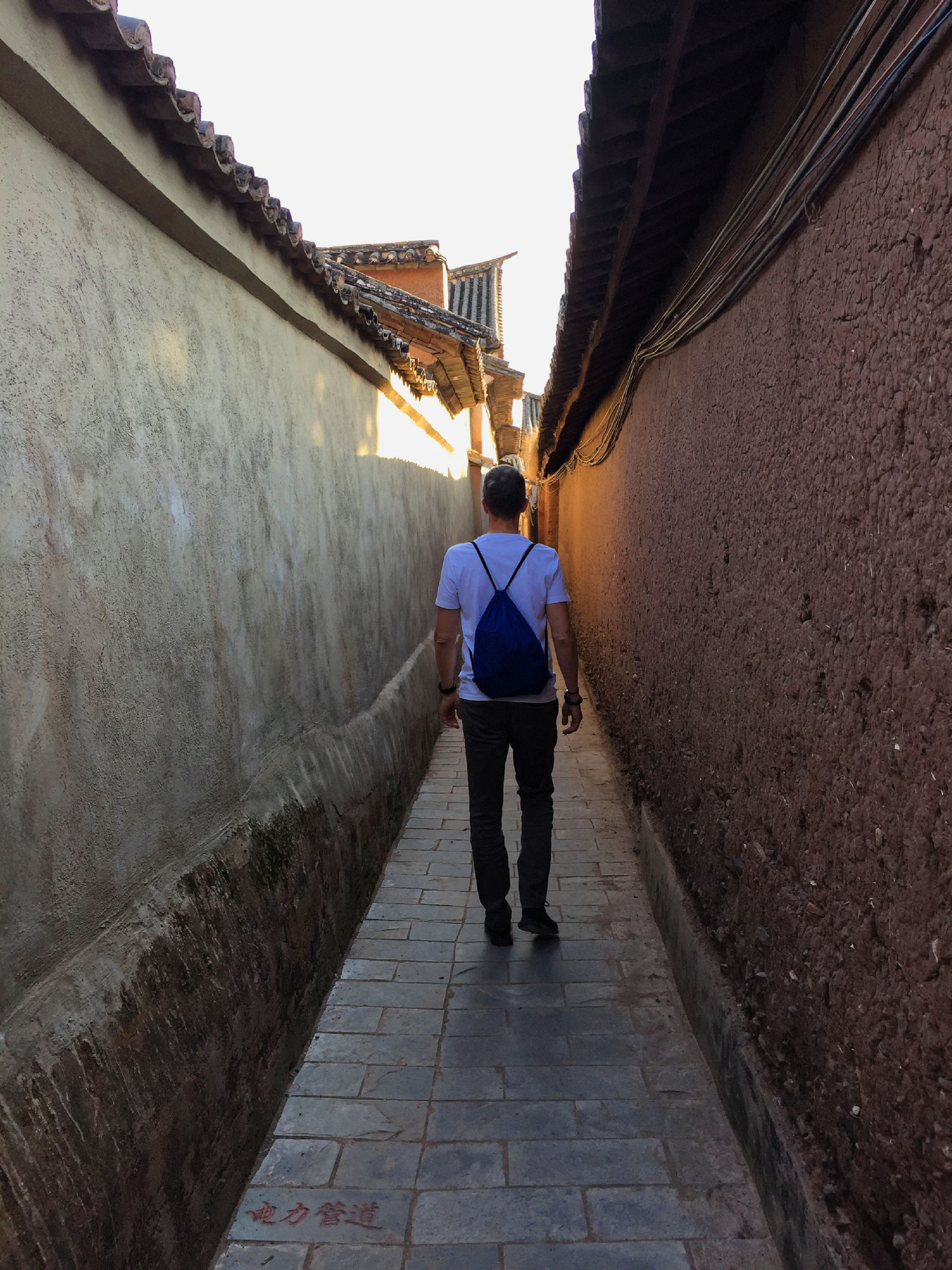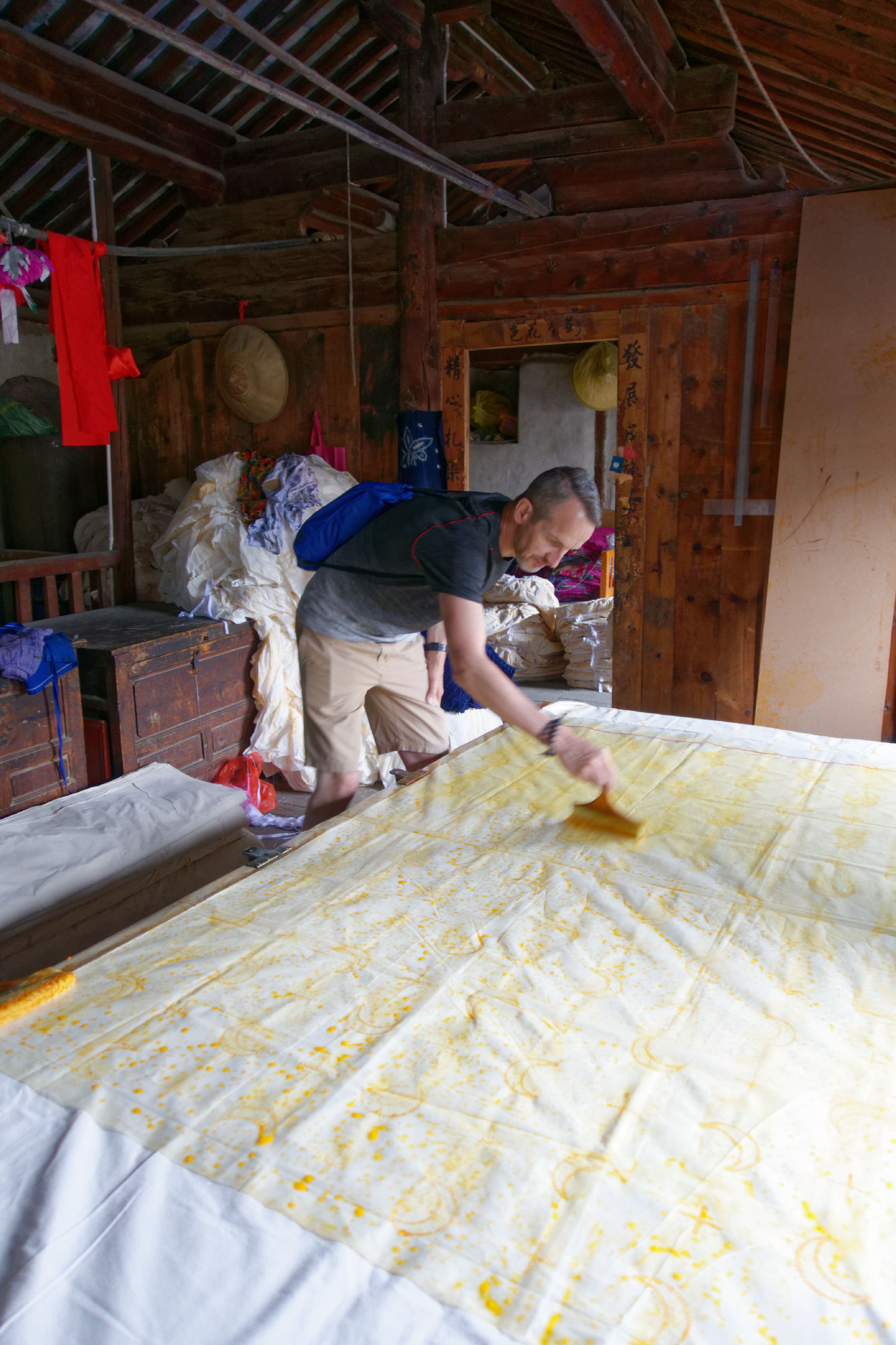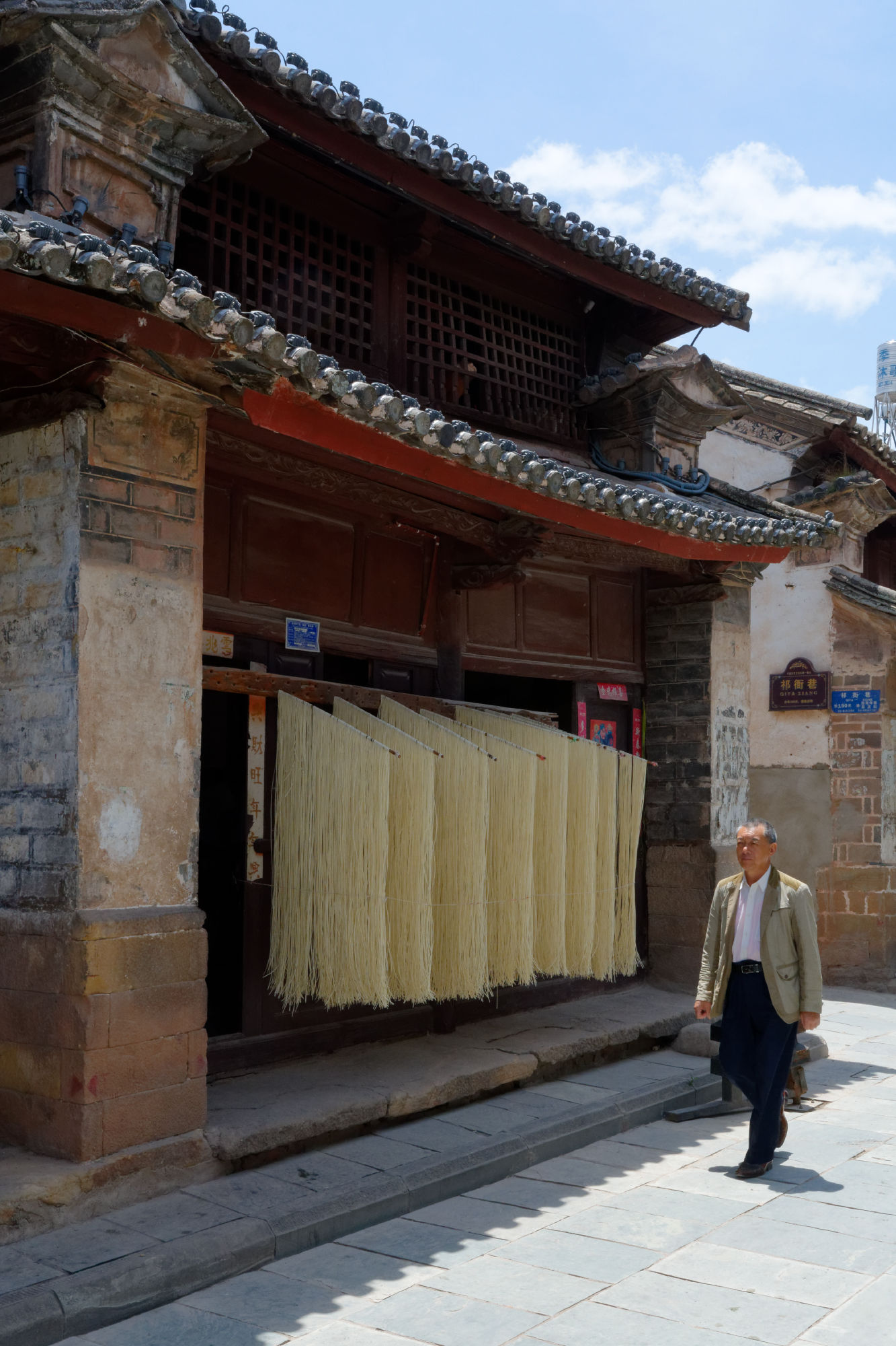 So liessen wir das bekannte Dali links liegen und konnten dank der spontanen Bereitschaft von Brian Linden im Bus einer amerikanisch-chinesischen Familie die erste Etappe zurücklegen, bevor wir dann wieder mal alleine unterwegs waren nach Weishan, einem verschlafenen Ort mit schön restaurierter Hauptgasse und einem nahen Berg mit zahlreichen Taoistischen Tempeln. In dieser Gasse wurden die Nudeln zum Trocknen an der Luft aufgehängt und einem der letzten Schriftenmaler konnten wir über die Schultern schauen. Ein lokales Team war gerade dabei, eine Dokumentation über den 92-Jährigen zu drehen, der überregional die Türrahmen für Neujahr oder auch im Todesfall beschriftet und mit entsprechenden Informationen kennzeichnet.