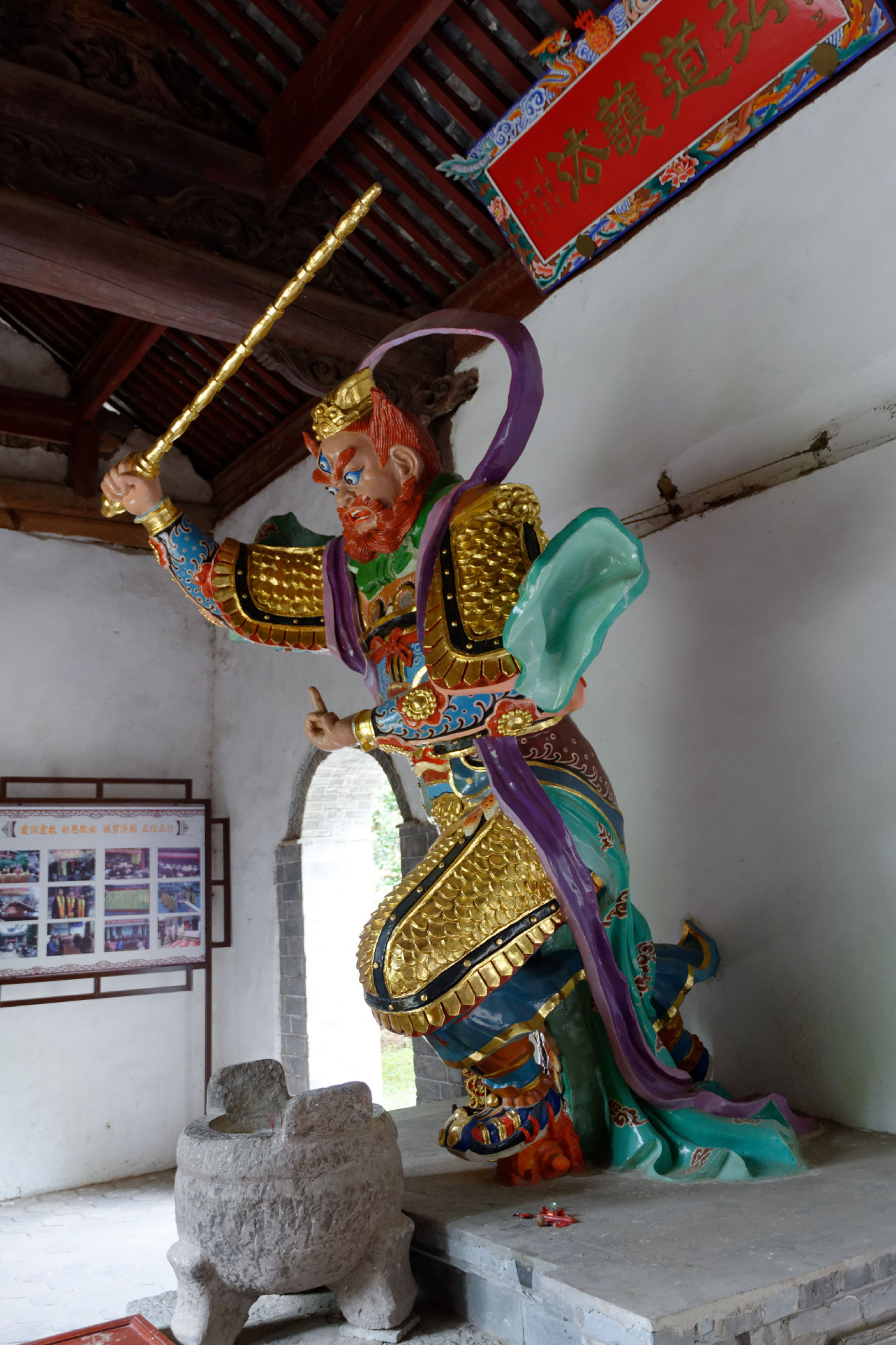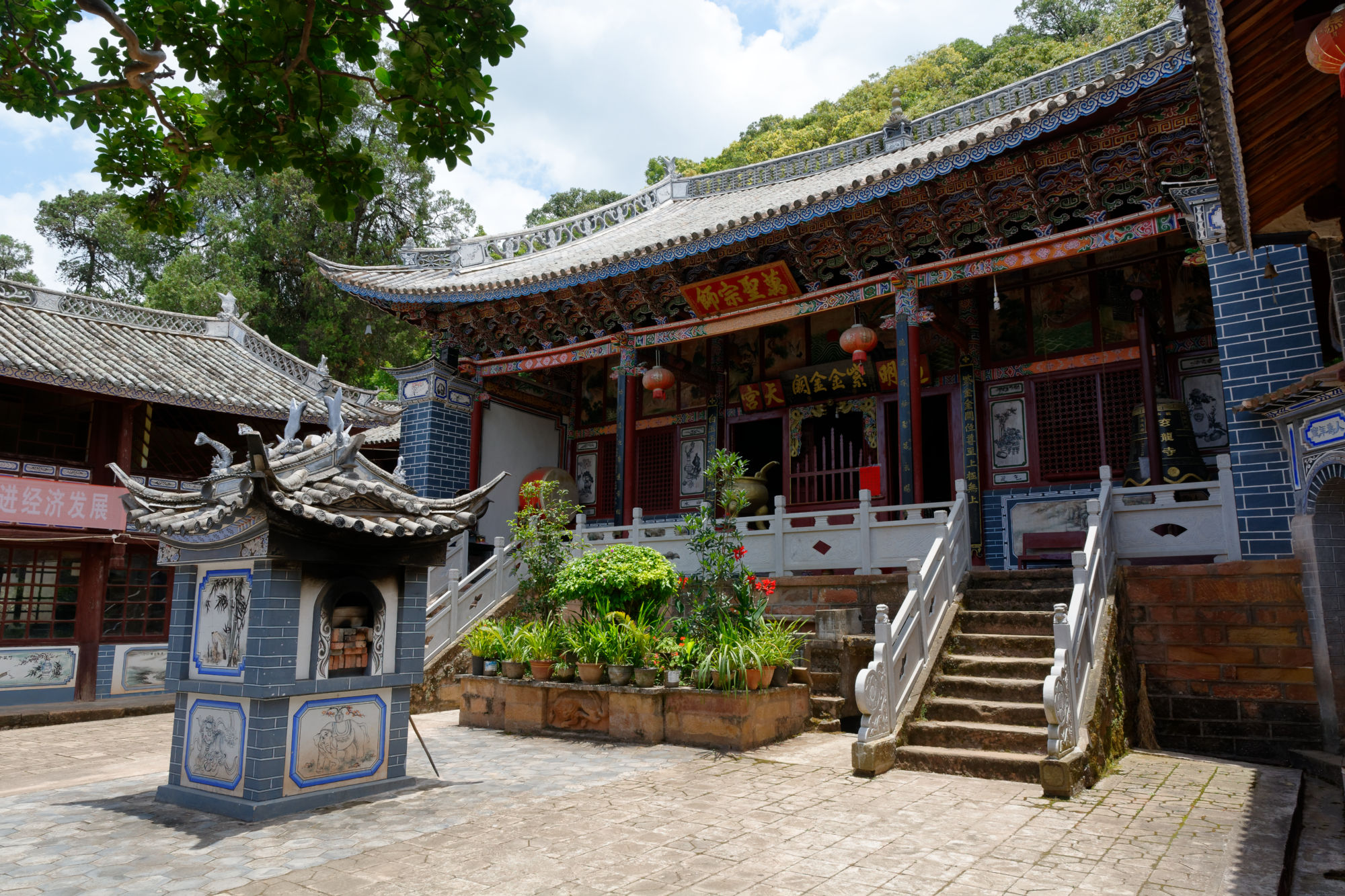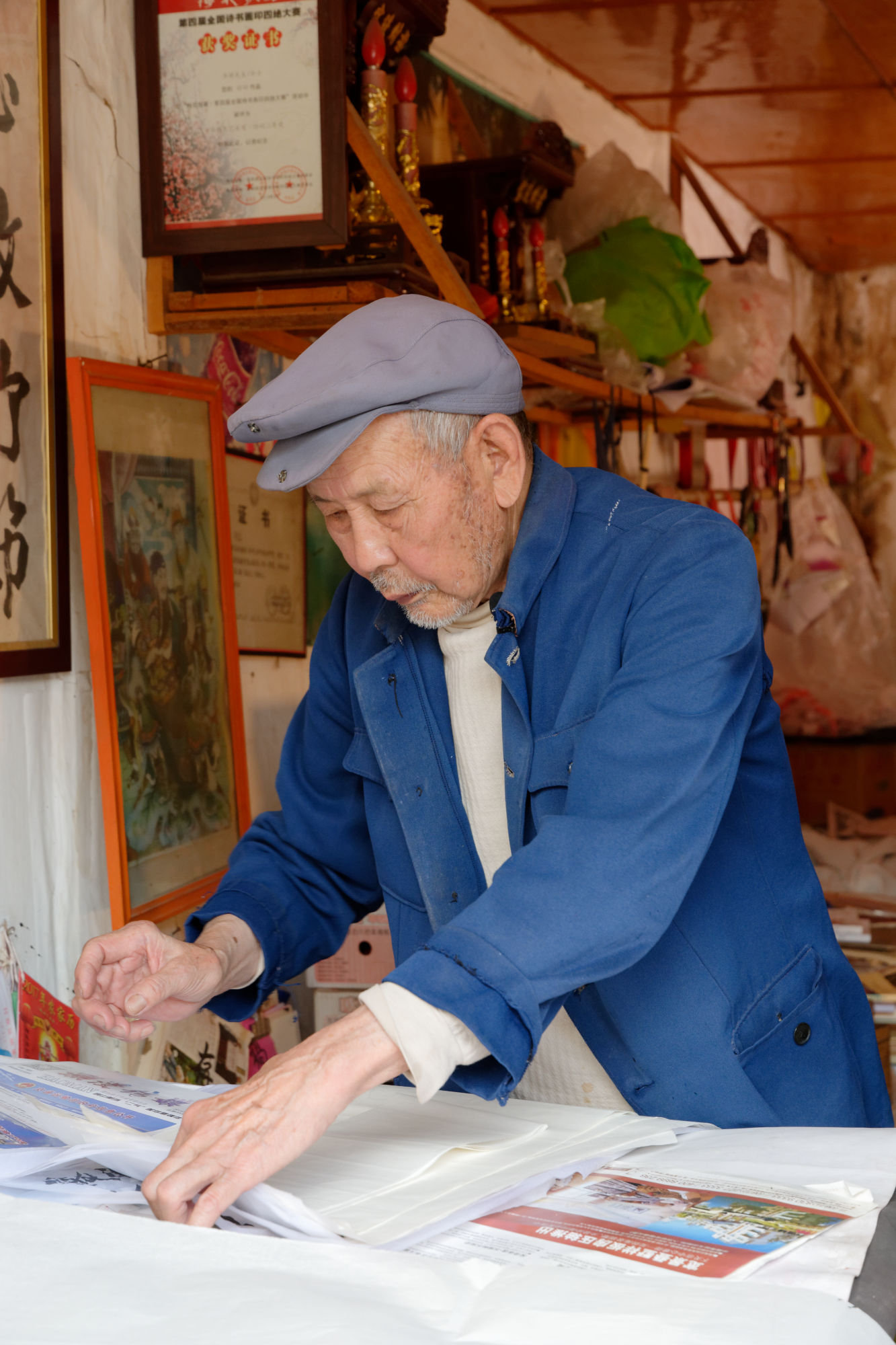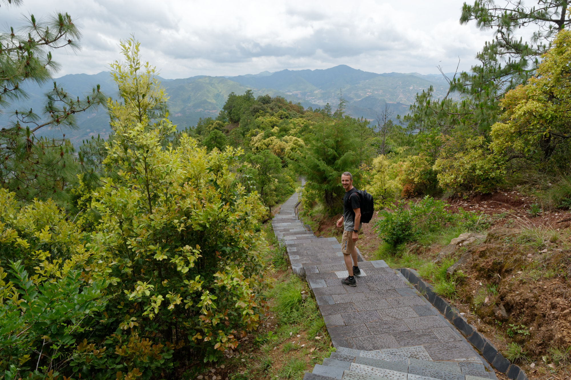 So liessen wir das bekannte Dali links liegen und konnten dank der spontanen Bereitschaft von Brian Linden im Bus einer amerikanisch-chinesischen Familie die erste Etappe zurücklegen, bevor wir dann wieder mal alleine unterwegs waren nach Weishan, einem verschlafenen Ort mit schön restaurierter Hauptgasse und einem nahen Berg mit zahlreichen Taoistischen Tempeln. In dieser Gasse wurden die Nudeln zum Trocknen an der Luft aufgehängt und einem der letzten Schriftenmaler konnten wir über die Schultern schauen. Ein lokales Team war gerade dabei, eine Dokumentation über den 92-Jährigen zu drehen, der überregional die Türrahmen für Neujahr oder auch im Todesfall beschriftet und mit entsprechenden Informationen kennzeichnet.
