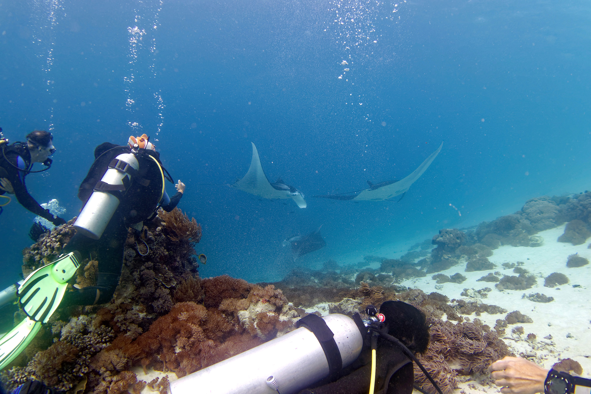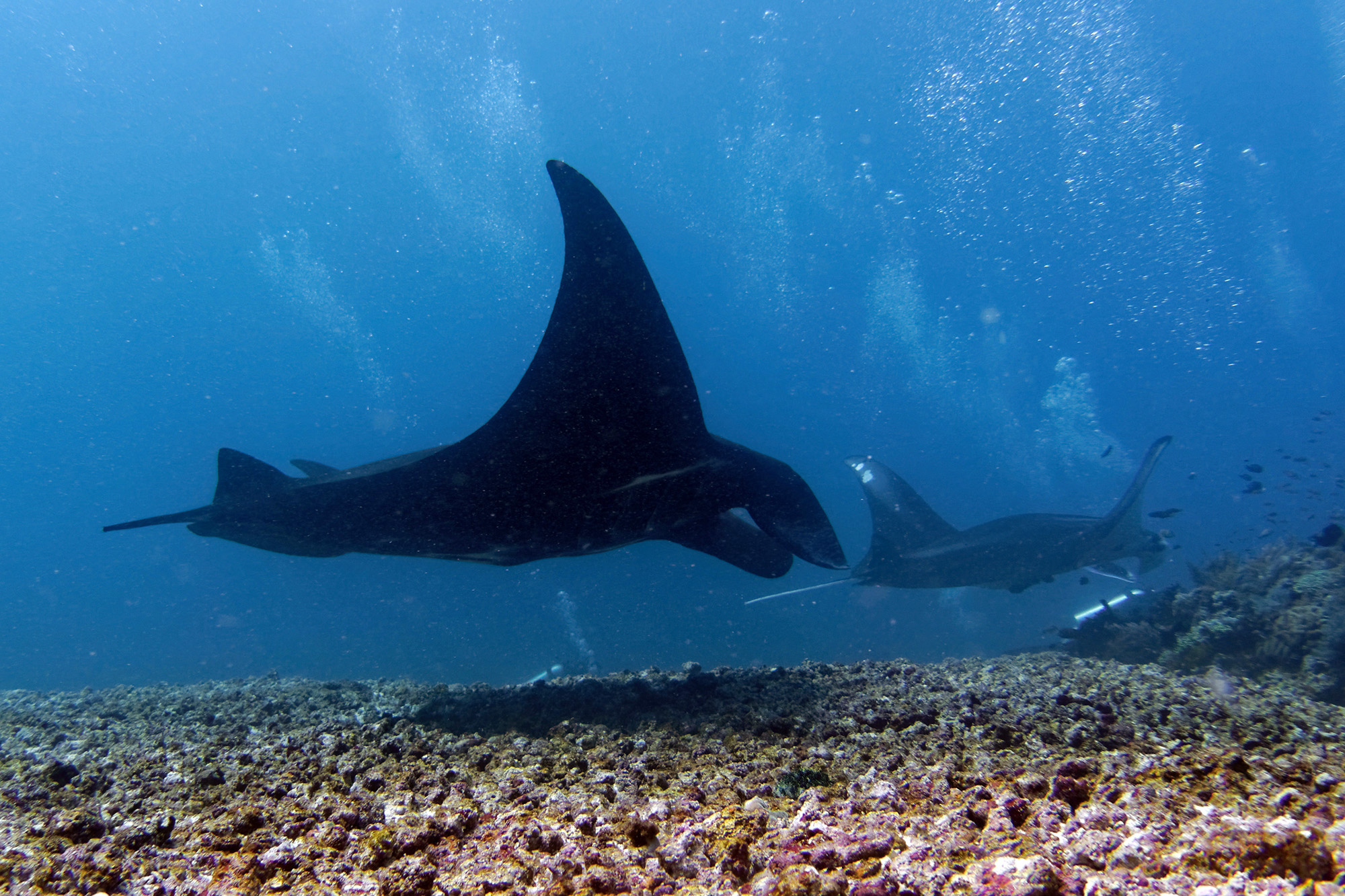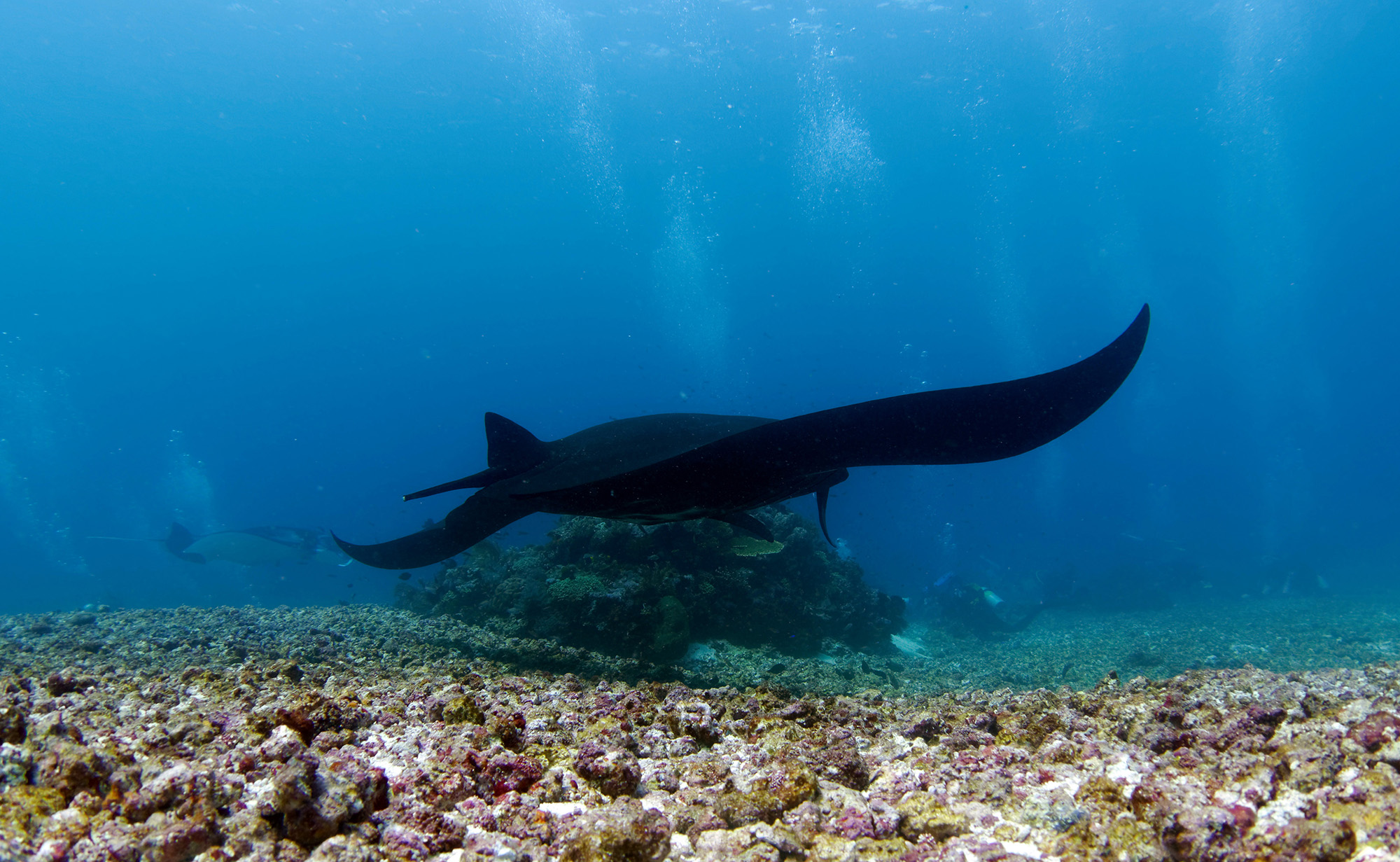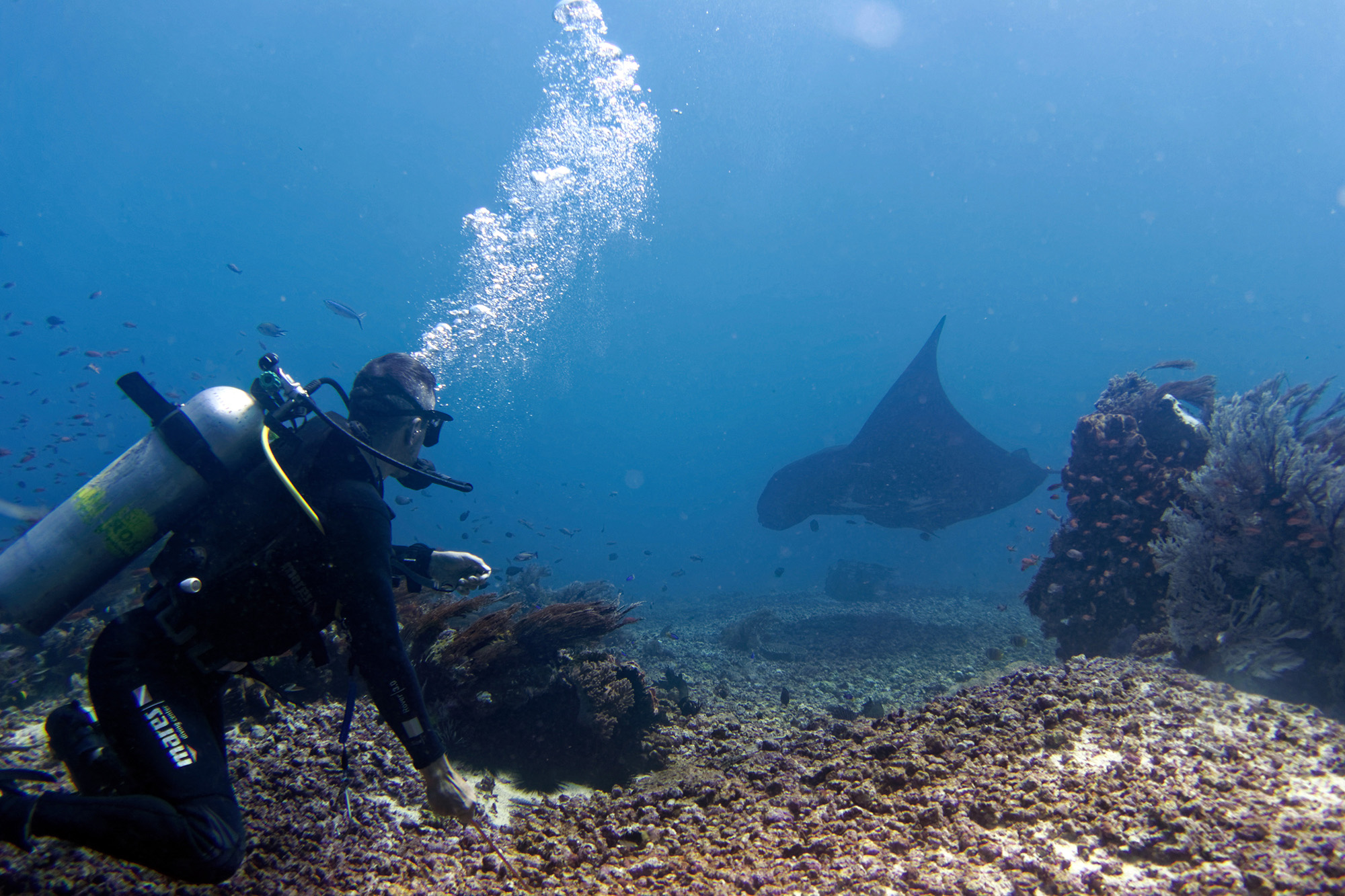 Mantas lieben es gegen die Strömung zu schwimmen; derart wird ihnen die Nahrung praktischerweise direkt in den Mund serviert. Ebenso sind sie neugierig und inspizieren die schwarzen, Luftblasen versprühenden Geschöpfe (sofern sie sich ruhig verhalten) gerne mal aus und ziehen ihre Kreise und Runden nahe an den Tauchern vorbei. Ein unheimlich elegantes Spektakeln diesen Geschöpfen mit ihren bis zu 5m Flügelspannweiten zuzuschauen, wie sie sich ohne Anstrengung im Wasser bewegen. Wir wurden geradezu süchtig nach diesen Begegnungen und haben den Mantapoint nochmals betaucht.