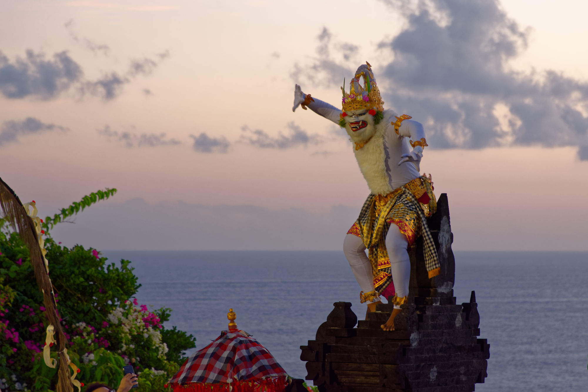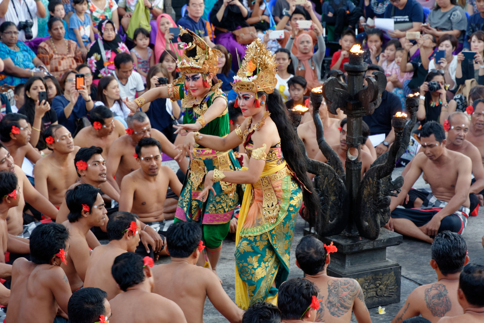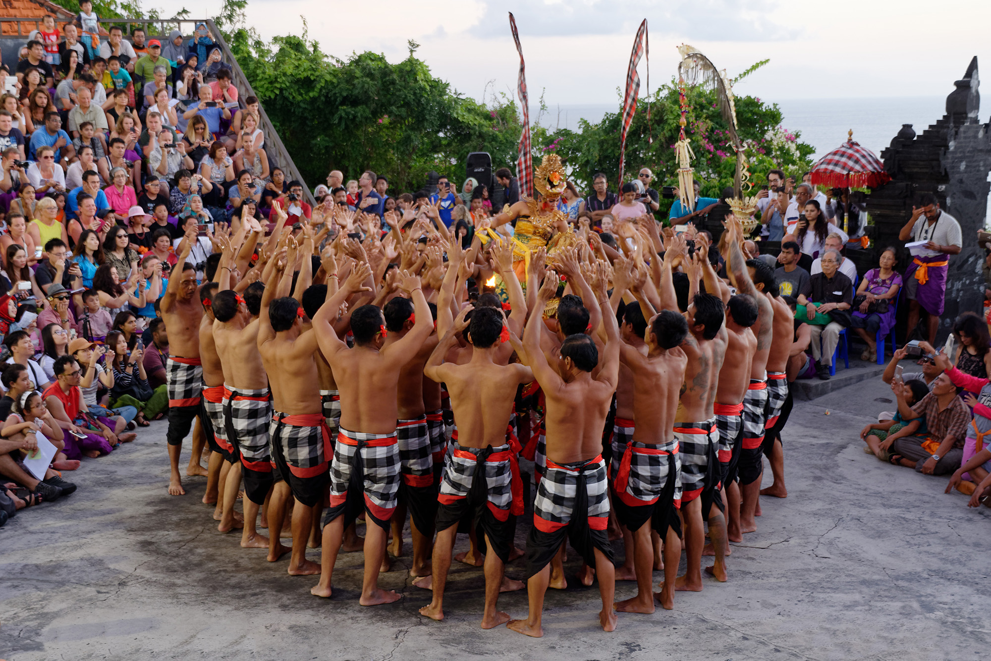 Auf der südlichen Halbinsel steht mit dem Pura Luhur Ulu Watu einer von mehreren Tempel zu Ehren der Meeresgeister, auf deren Unterstützung wir weiterhin zählen. Über den steil abfallenden Klippen wird bei Sonnenuntergang der traditionelle Kecak-Tanz (Affentanz) aufgeführt, der die hinduistische Legende von Rama und Sita erzählt. Den akustischen Rahmen bildet eine Gruppe von ca. 70 Tänzer, welche mit ihrem rhythmischen „kecak-kecak, cak-cak-cak“ Gesang sich und die Zuschauer in eine beinahe hypnotische Stimmung versetzen. Nach gewonnener Schlacht stehen die Schauspieler sogar für „Selfies“ bereit!