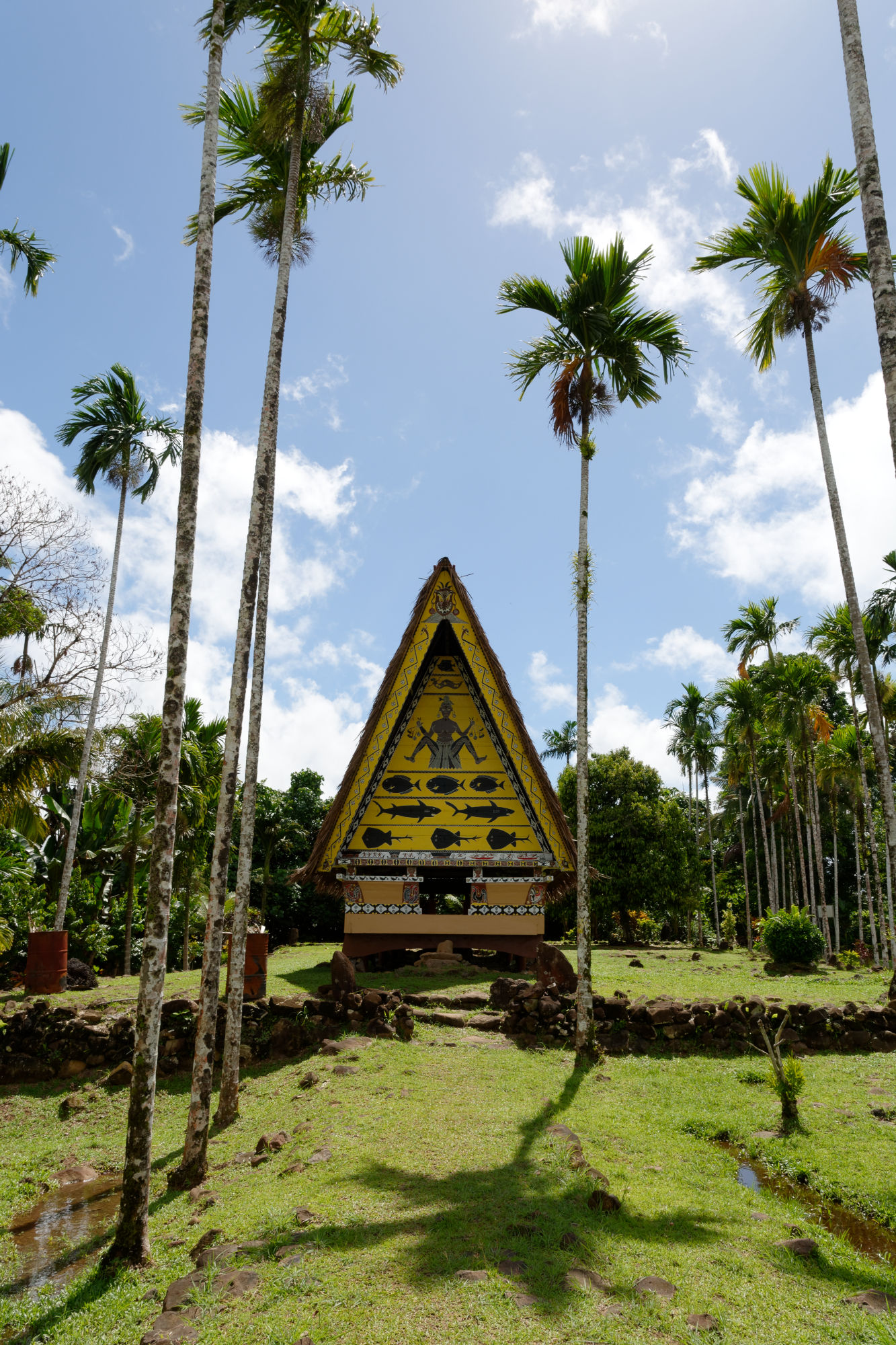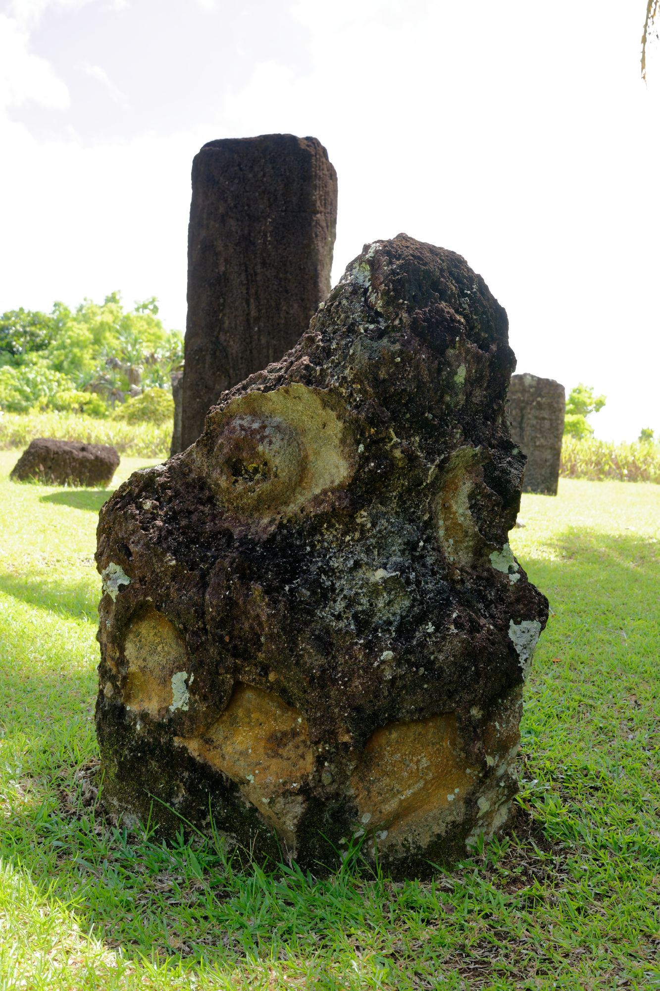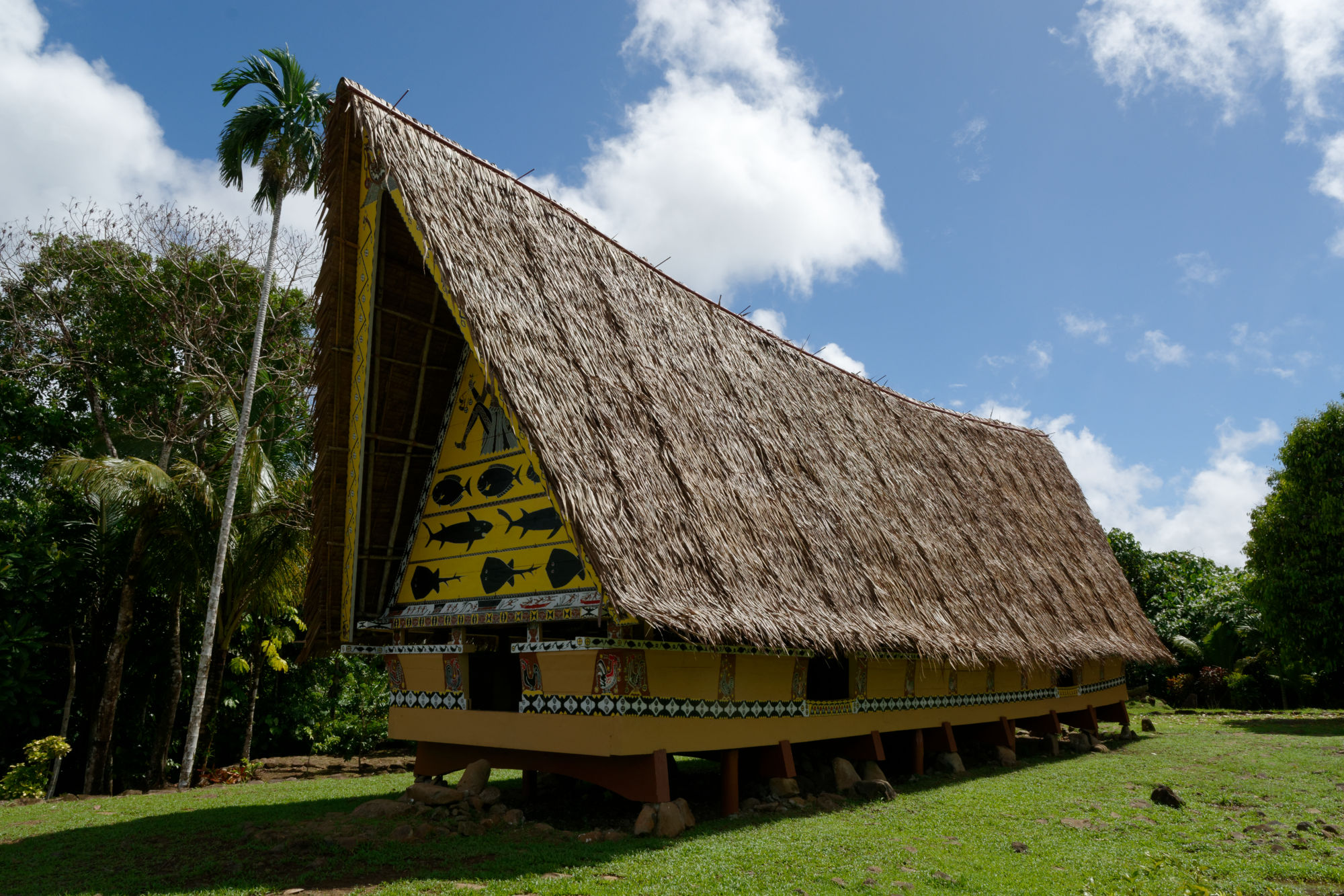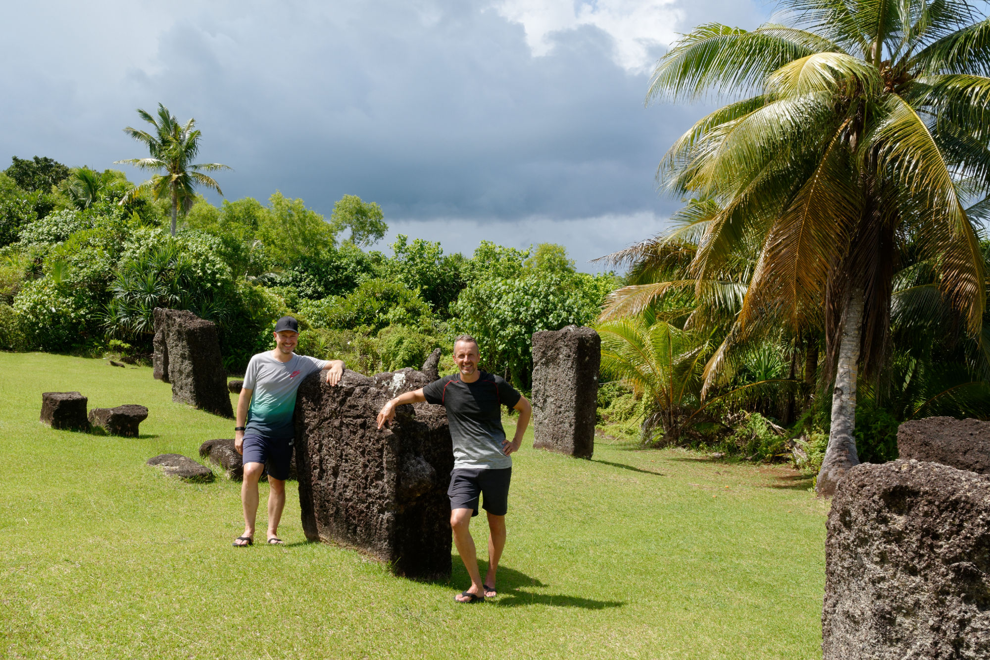 Nach der Woche auf dem Tauchschiff und noch mit leichten Schwanken unternahmen wir mit dem Tauchguide Ripon, der nun als Fremdenführer und Chauffeur waltete, einen Tagesausflug auf die Nordinsel Babeldaob. Die Insel misst ca. 44km in der Länge und 14km in der Breite und besteht aus nicht weniger als 10 Staaten („Kantone“) mit einer Bevölkerung von total ca. 10’000 Einwohnern. Vielleicht könnte da der Kanton Glarus mal ein Hilfsprojekt lancieren…. Jeder Staat hat weiterhin ein Gemeindehaus „Bai-Haus“, wo die Männer der Clans die wichtigen Entscheidungen treffen. Die Verzierungen auf den Holzbalken erzählen von den Schwerpunkten des Palauischen Lebens, wo einerseits der Hahn wie auch die Meerestiere eine zentrale Rolle spielen. Einzigartig ist auch das Verkehrssystem von Palau: Die Fahrzeuge verkehren auf der rechten Strassenseite, sind aber rechtsgesteuert. Erklärt wurde uns dies damit, dass die Fahrzeuge am billigsten aus dem „linksgesteuerten“ Japan importiert werden. Abkühlung fanden wir bei einer Wanderung im tropischen Regenwald und einem kühlen Wasserfall, bevor wir die Steinmonolithen (80-150 n.Chr.) besuchten, die teilweise Gesichter zeigen und entfernt an Steingesichter der Osterinseln erinnern.
