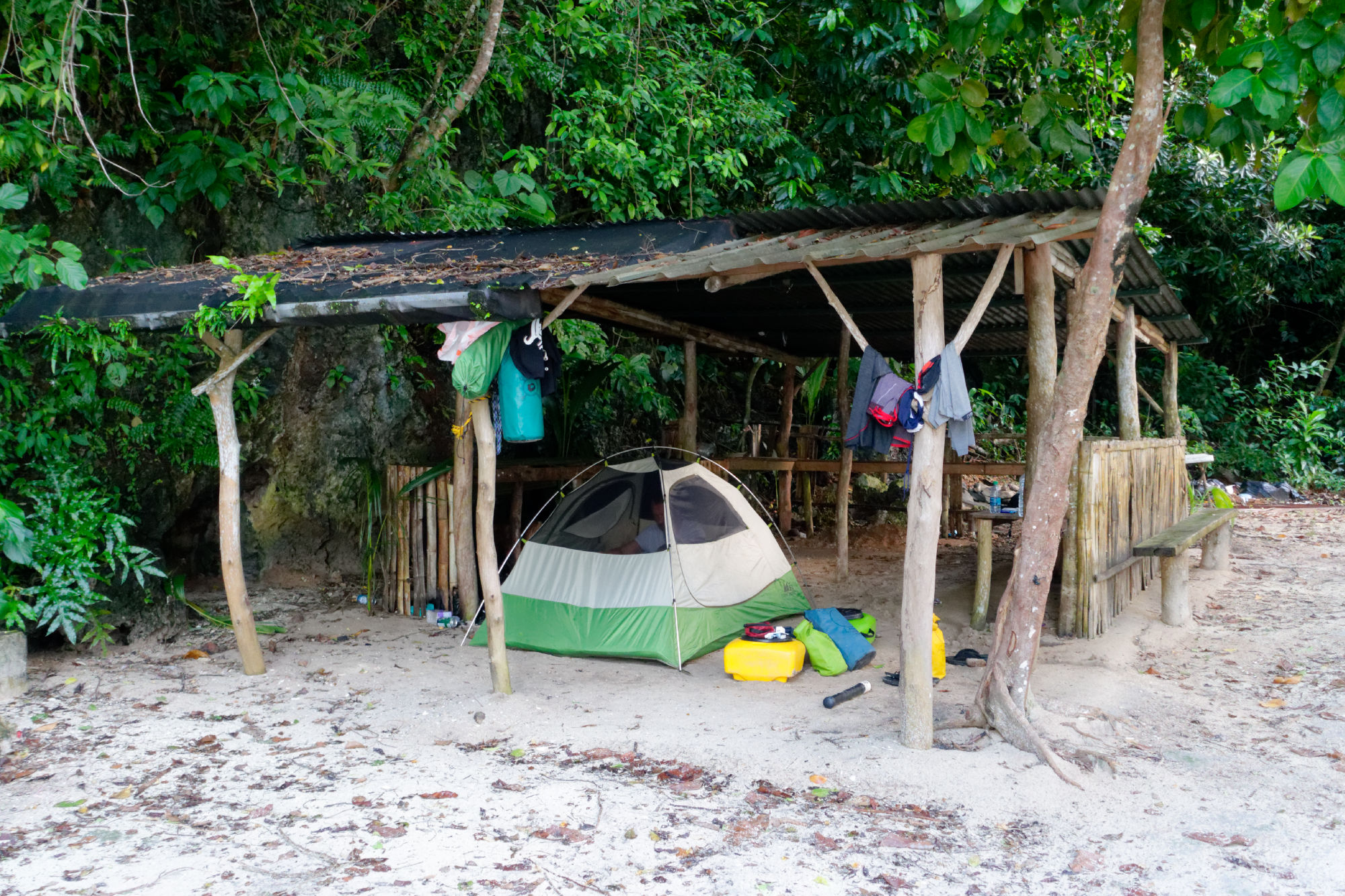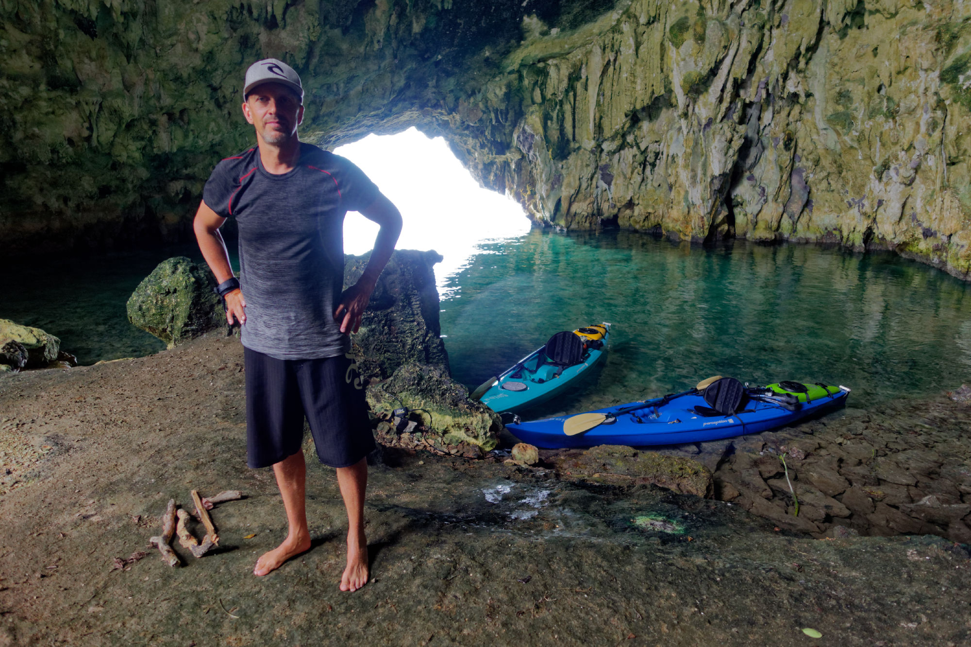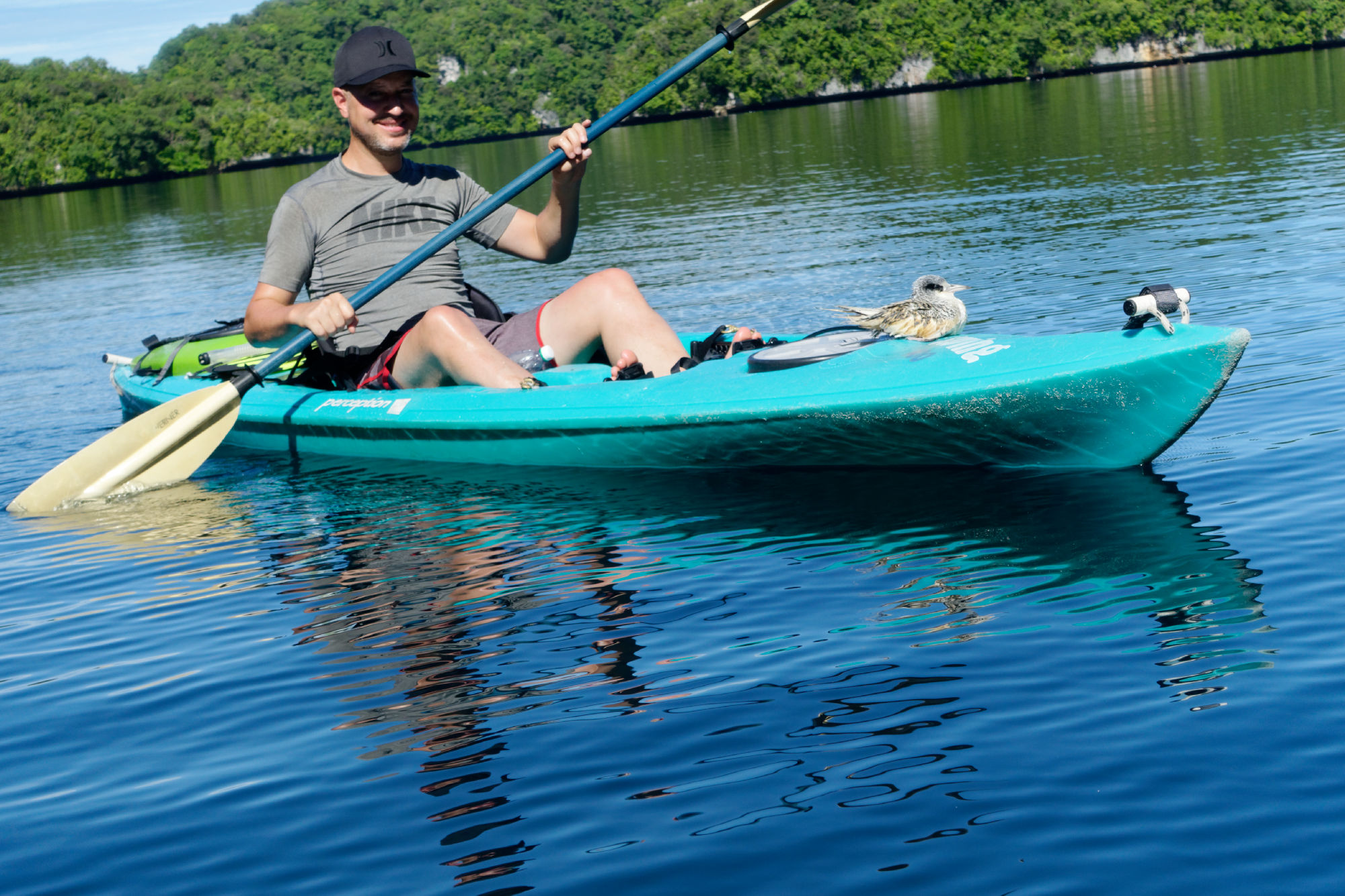 Mit den eher faden Eindrücken vom Land entschieden wir, dass Palau’s beste Seiten auf und unter dem Wasser liegen, also nix wie los und um die Inseln gepaddelt. Dies war dann doch anstrengender als anfänglich gedacht. Zudem ist man dem Wetter, von brütendem Sonnenschein zu Gewitterregen voll ausgesetzt. Entschädigt wurden wir durch die totale Einsamkeit, umschwärmt von Vögeln, die ihre Nester gegen uns verteidigten und klarem Vogelgesang in einsamen Buchten. Das Nachtlager am Blue Devil Sandstrand ein weiterer Höhepunkt. Zwischendurch noch schnell ein Vogel aus dem Pazifik gerettet und ein japanisches Schiffswrack entdeckt.