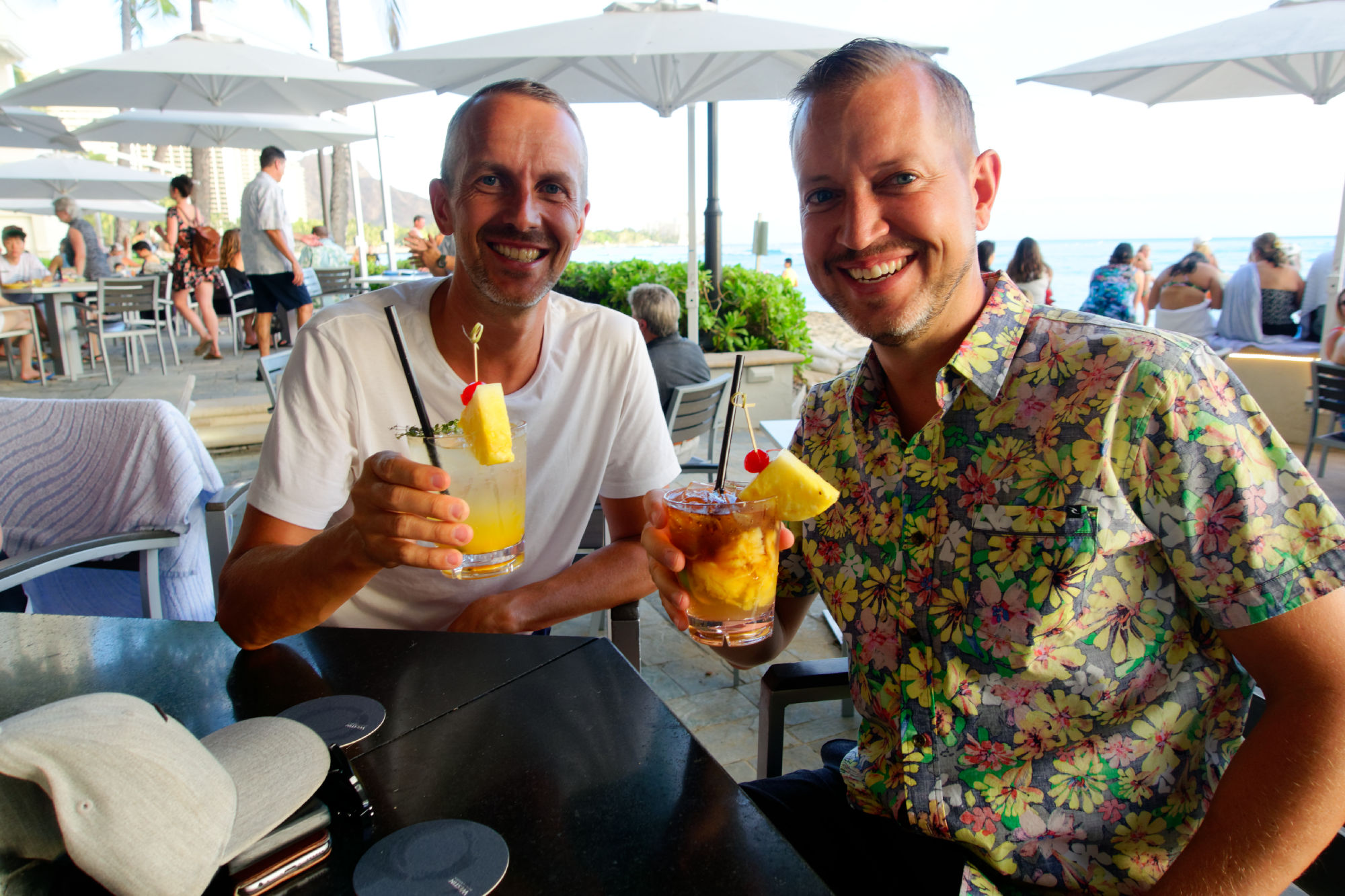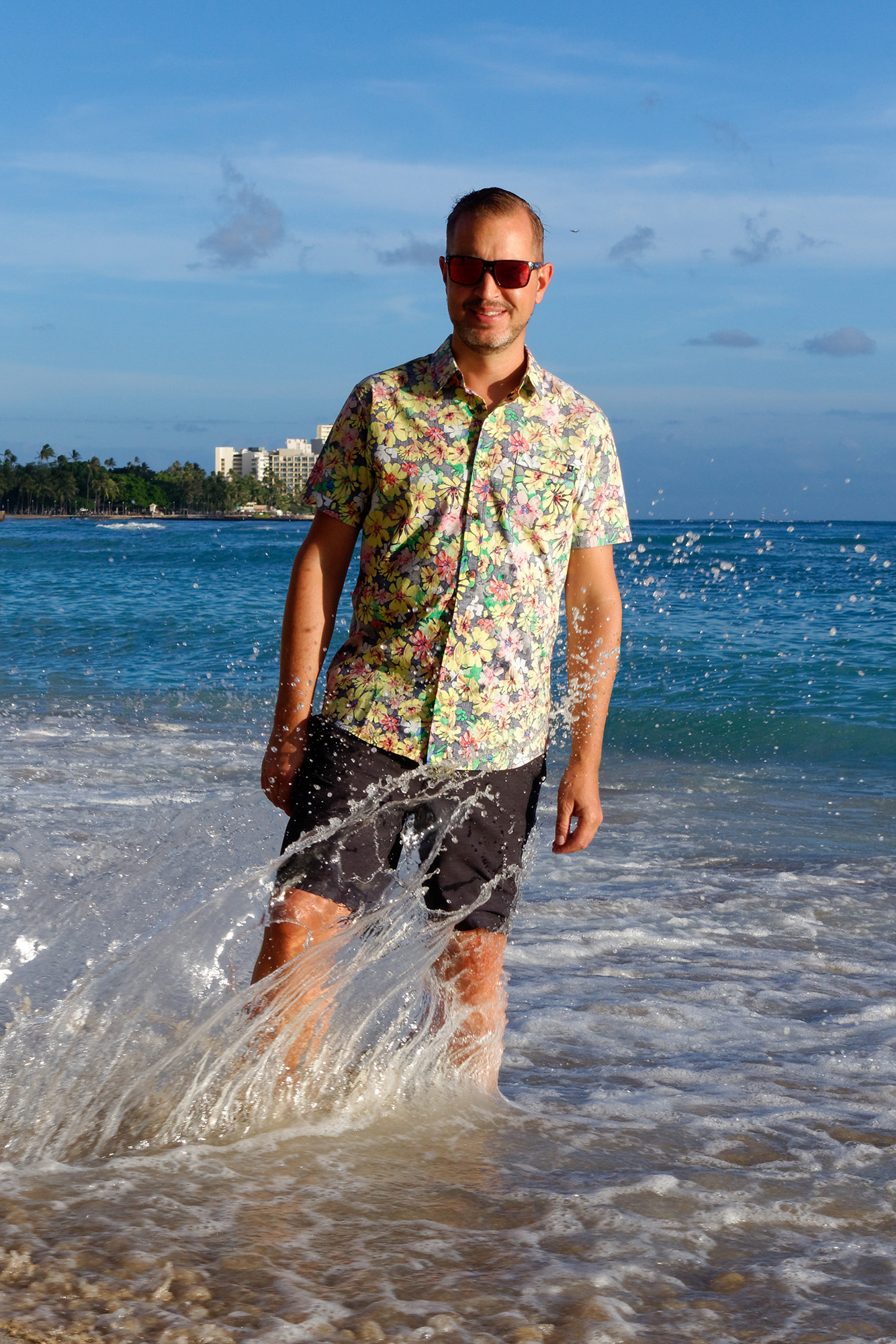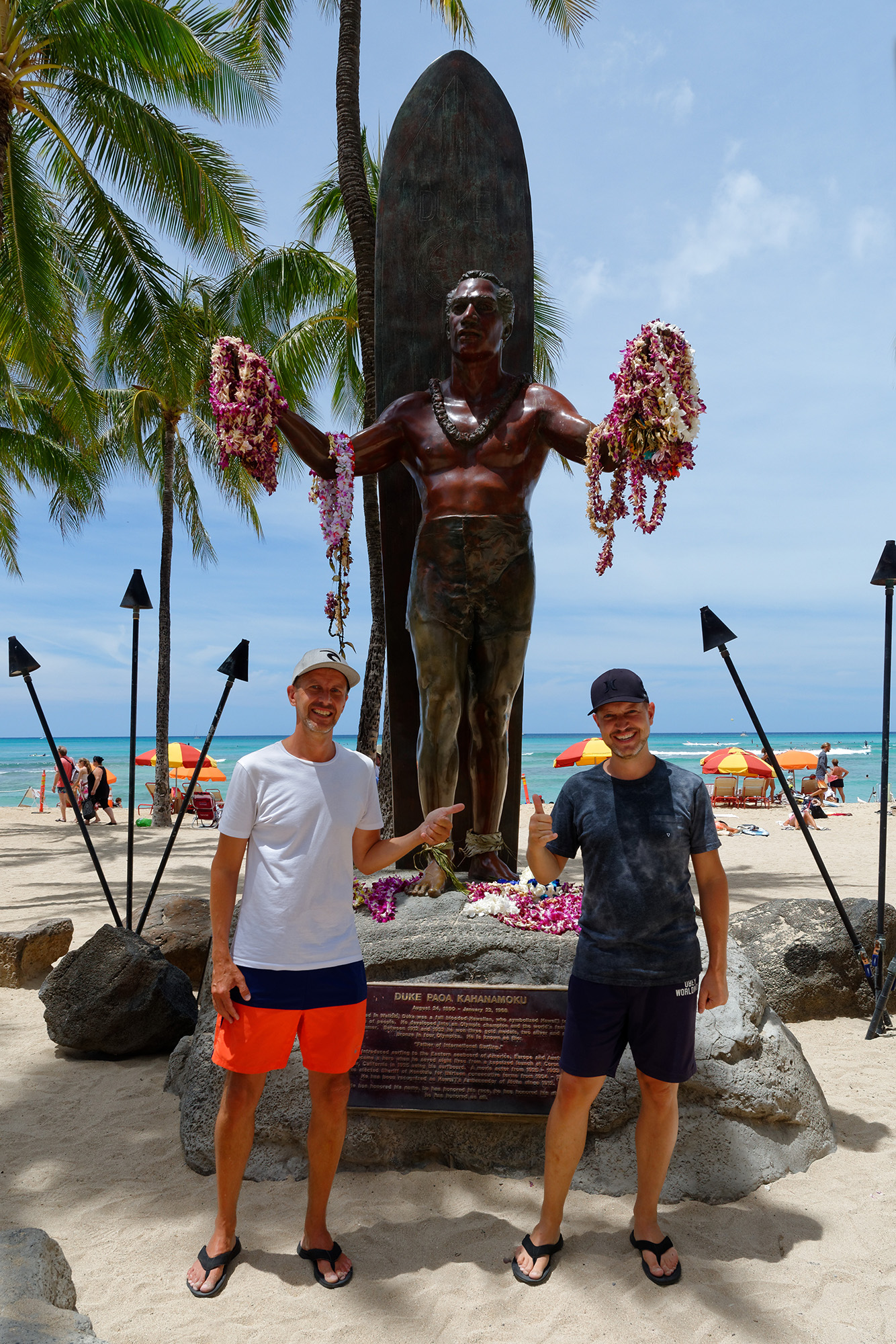 Nach beinahe 3 Wochen auf Hawaii fällt uns der Abschied sichtlich schwer. Zwar ist Honolulu, respektive Waikiki mit seinen Strassenschluchten, Verkehrsstau und Hochhausensemble schon sehr amerikanisch geprägt. Doch der nur zwei Blocks entfernte Stadtstrand erlaubt uns, nochmals direkt vom Hotel aus in Flipflops und Badehose ins Meer zu springen. Und wo anders gibt es eine Statue eines Stadtpräsidenten, der in Badehose mit Surfbrett posiert? In dem Sinne „A hui hou“ = „Adieu, bis wir uns wiedersehen“.