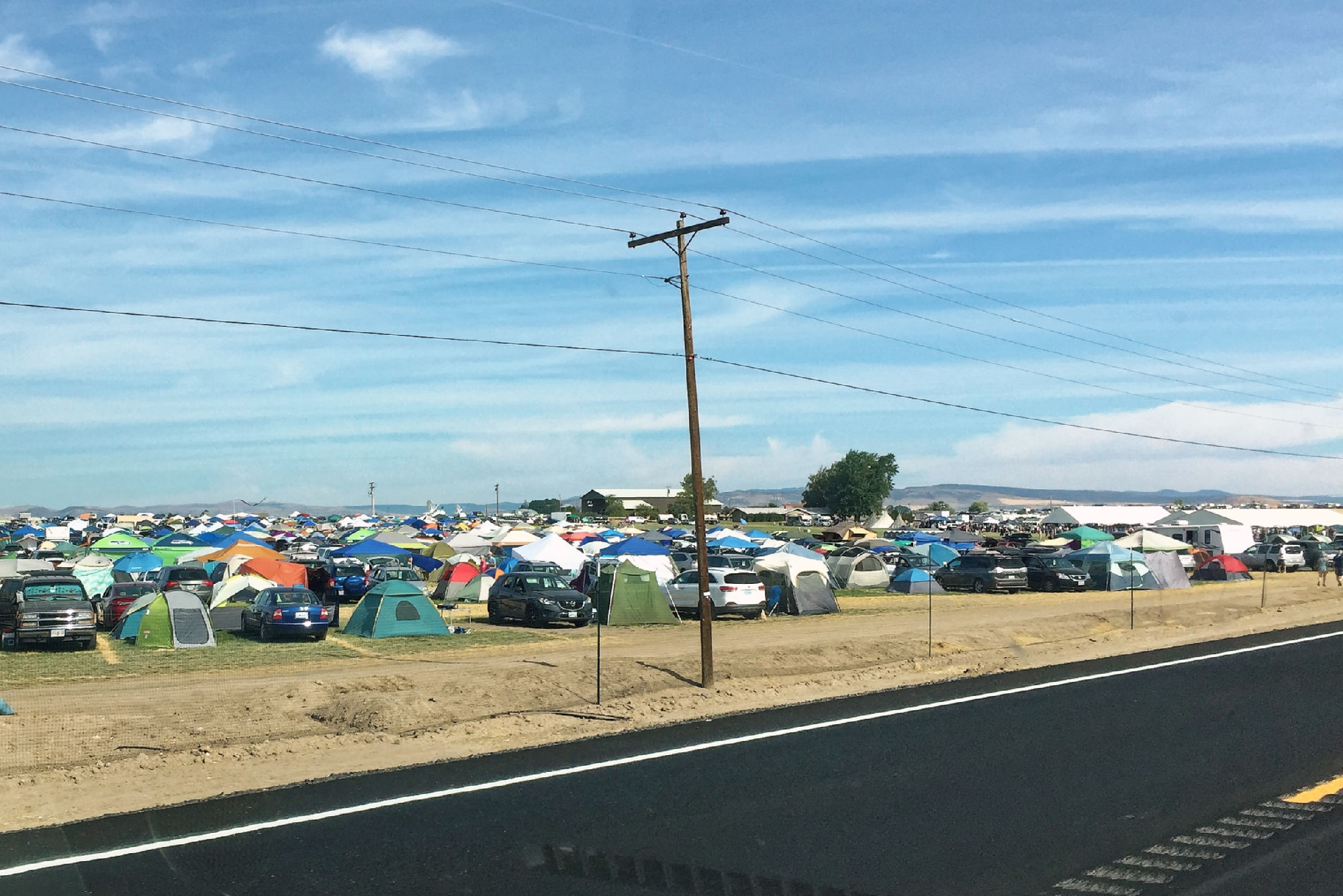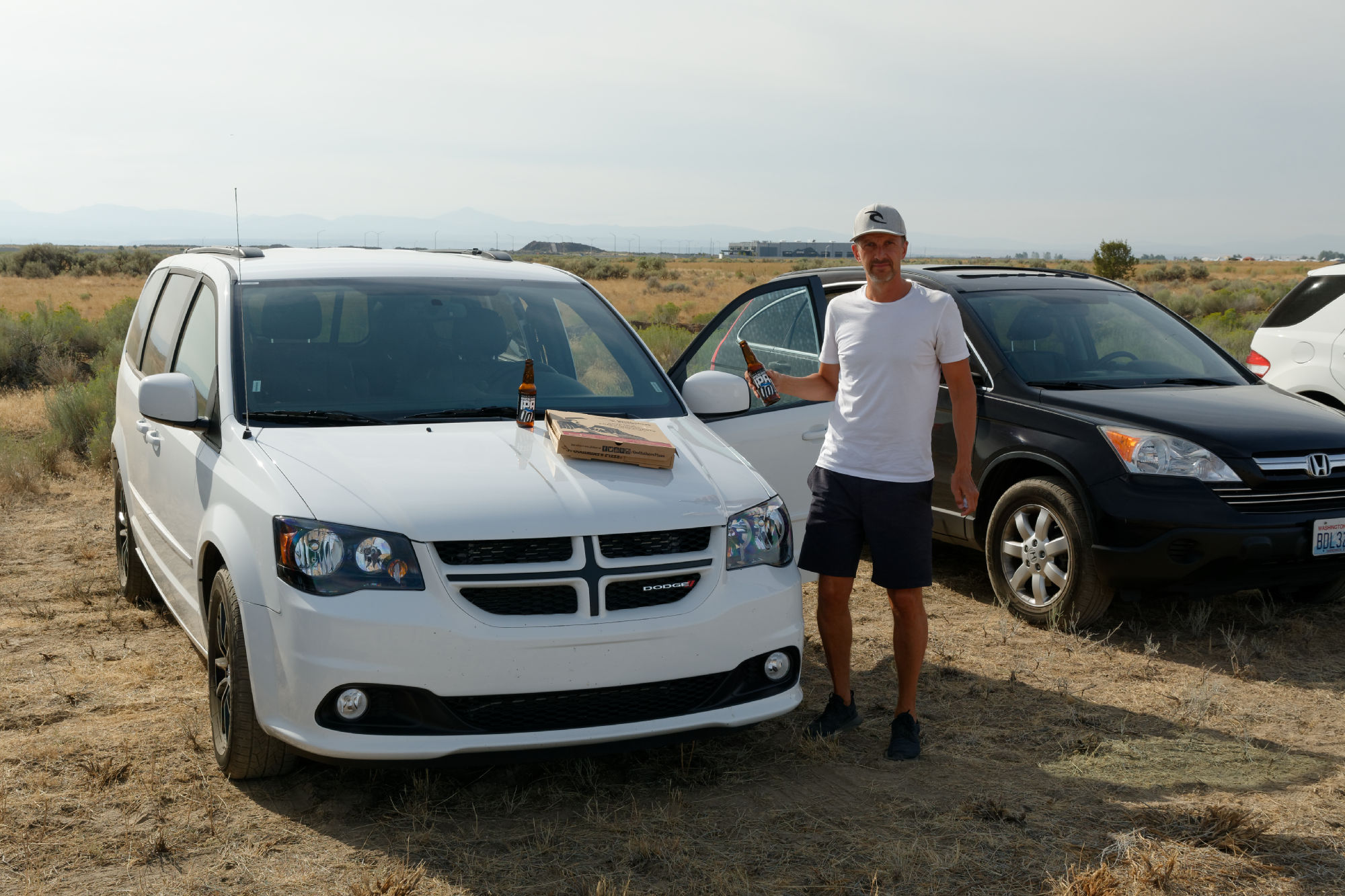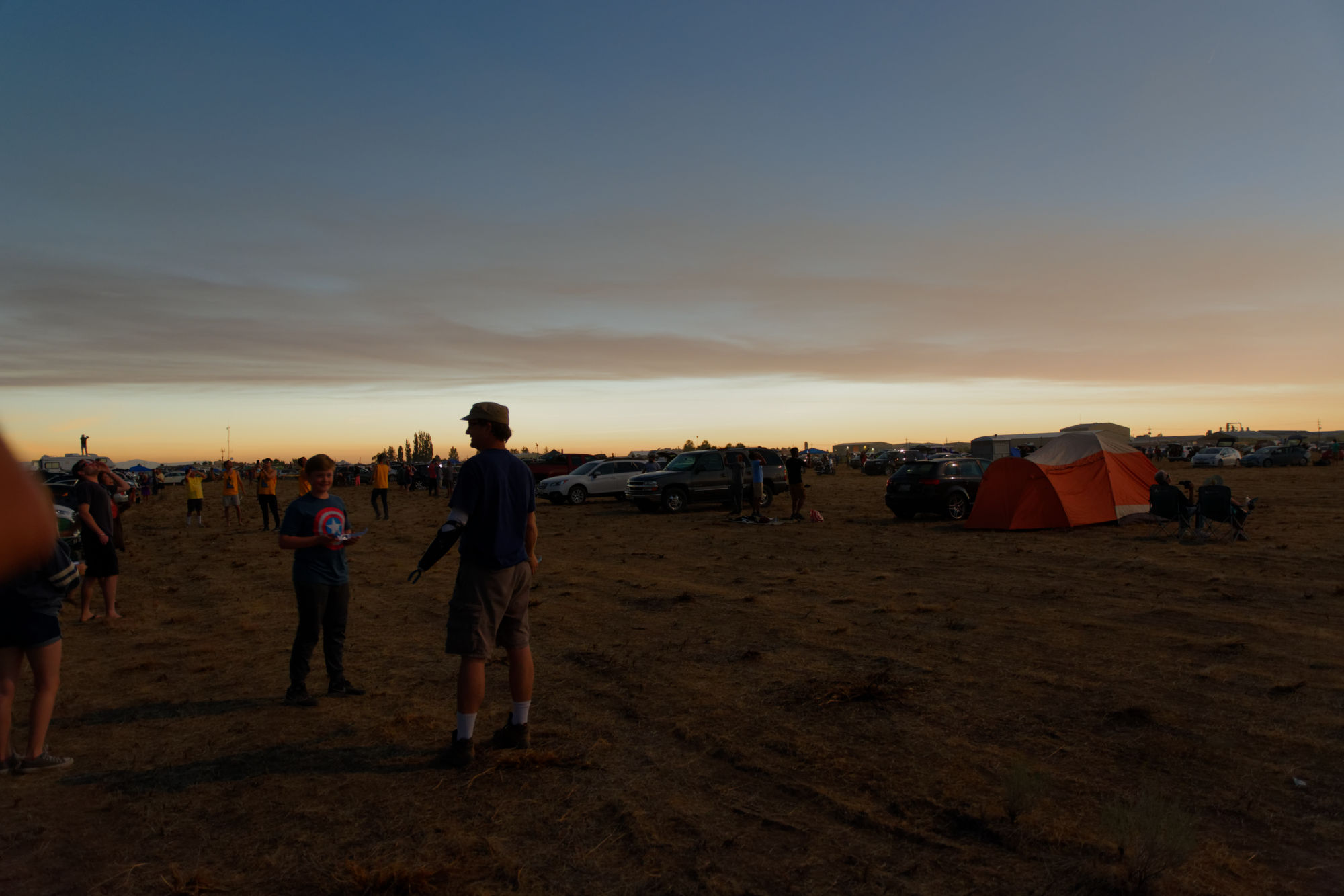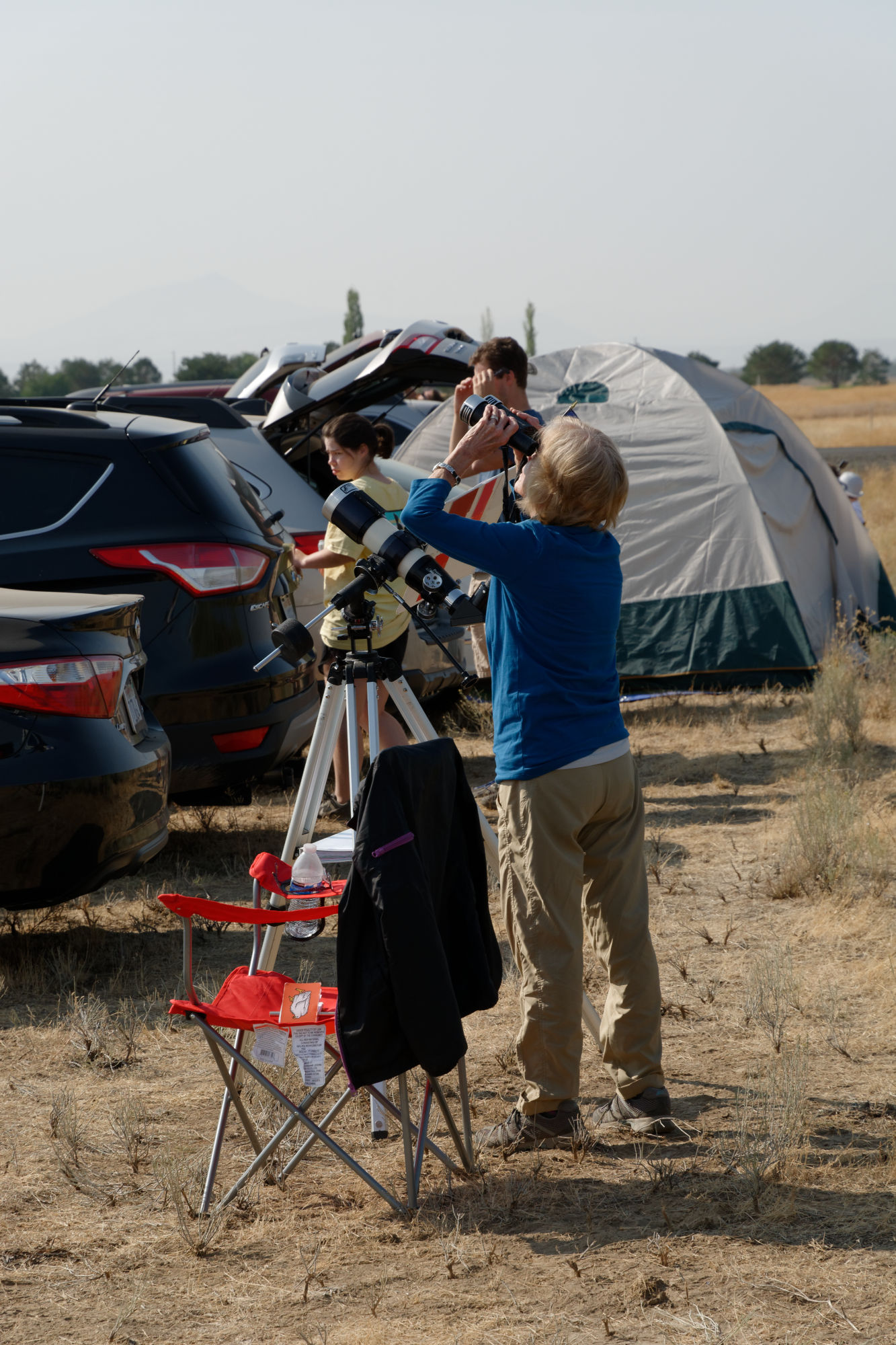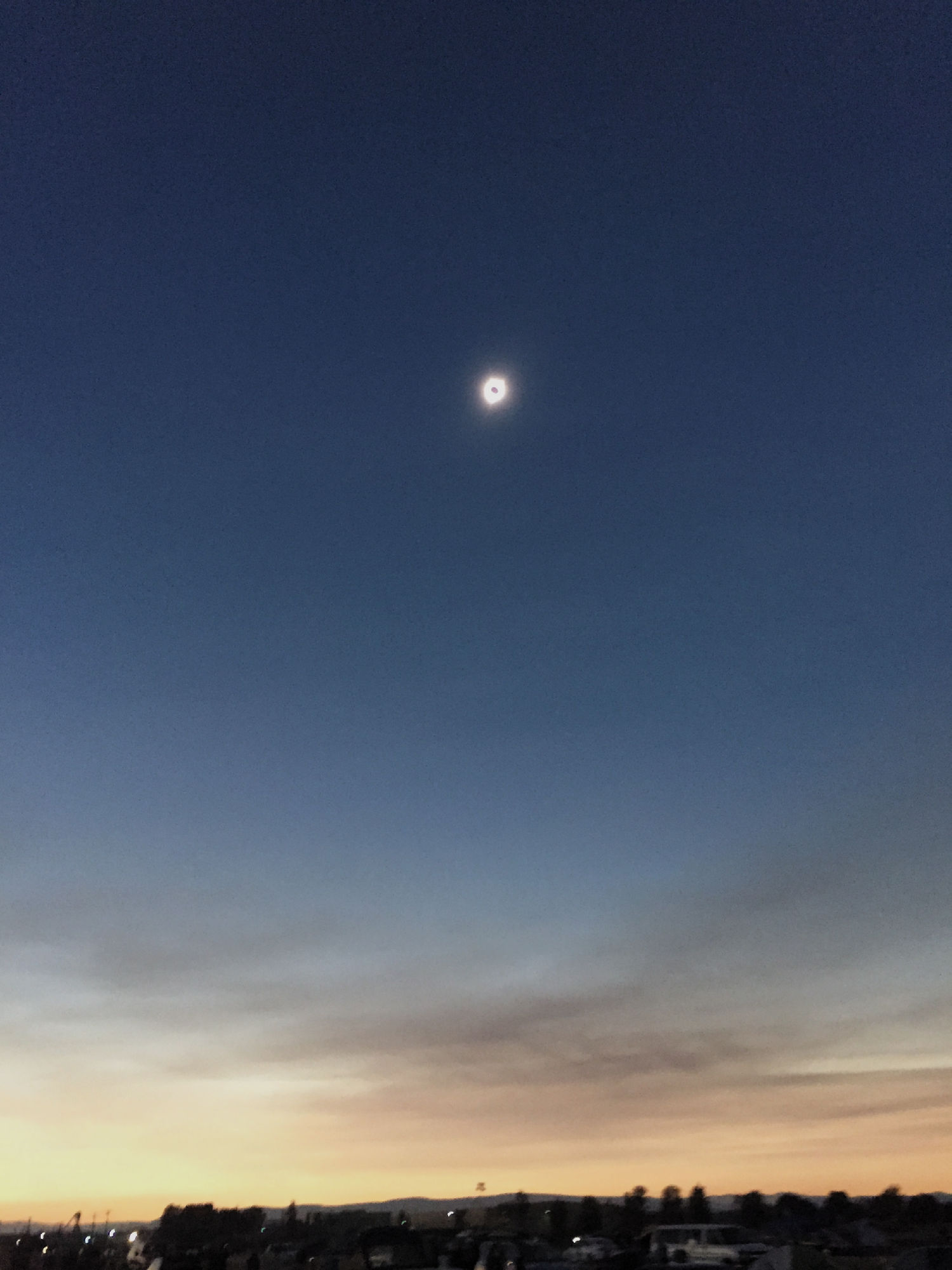 Es war ja schon lange bekannt, dass am Montag, 21. August 2017 eine totale Sonnenfinsternis über die USA ziehen wird. Auch wir sind bereits bei der Vorbereitung unserer Reise auf dieses Datum gestossen; nur wussten wir lange nicht, ob wir zu jenem Zeitpunkt auch in der Nähe sein werden. Mit der Planung unseres letzten Teils der Reise durch Kalifornien, haben wir dies dann konkret in Angriff genommen. Den Flug nach Portland, das knapp 200 km nördlich des Zentrums der Finsternis liegt, ging noch flott. Ein Hotel in der besagten Zone zu finden war dann schon unmöglich und 1’000 USD für eine Lotterbude oder 200 USD für einen Campingplatz im Vorgarten war uns doch zu viel. Was also? Einen grossen Wagen mieten in dem wir auch schlafen werden und dazu einen Parkplatz für lumpige 25 USD. Freundlicherweise hat uns Rosa aus San Francisco, die wir früher auf der Reise in Shaxi kennengelernt hatten, noch mit warmen Decken ausgestattet. Natürlich haben wir auch den besten Ort gegoogelt und uns für Madras im zentralen Oregon entschieden: gut erreichbar, geringe Luftfeuchtigkeit, Hochebene. Nicht erstaunlich haben das auch andere rausgefunden…. Am Sonntag Mittag, 24 Stunden vor dem Ereignis sind wir gelandet, unseren Familienvan mit versenkbaren Sitzreihen bezogen, beim Safeway mit Getränken und Esswaren eingedeckt, welche das Überleben für die nächsten Tage sicher stellen wird. Mit grossen Erstaunen verlief die Anreise nach Madras ohne Probleme und der Parkplatz auf der abgemähten Wiese neben dem Flughafen war bald bezogen. Die Party im Hangar war schon in vollem Gange und die Teilnehmer waren teilweise sogar mit dem Flieger angereist. Auch Essen und Getränke waren in rauen Mengen vorhanden. Soweit also „Doppelt gemoppelt, hält besser“…