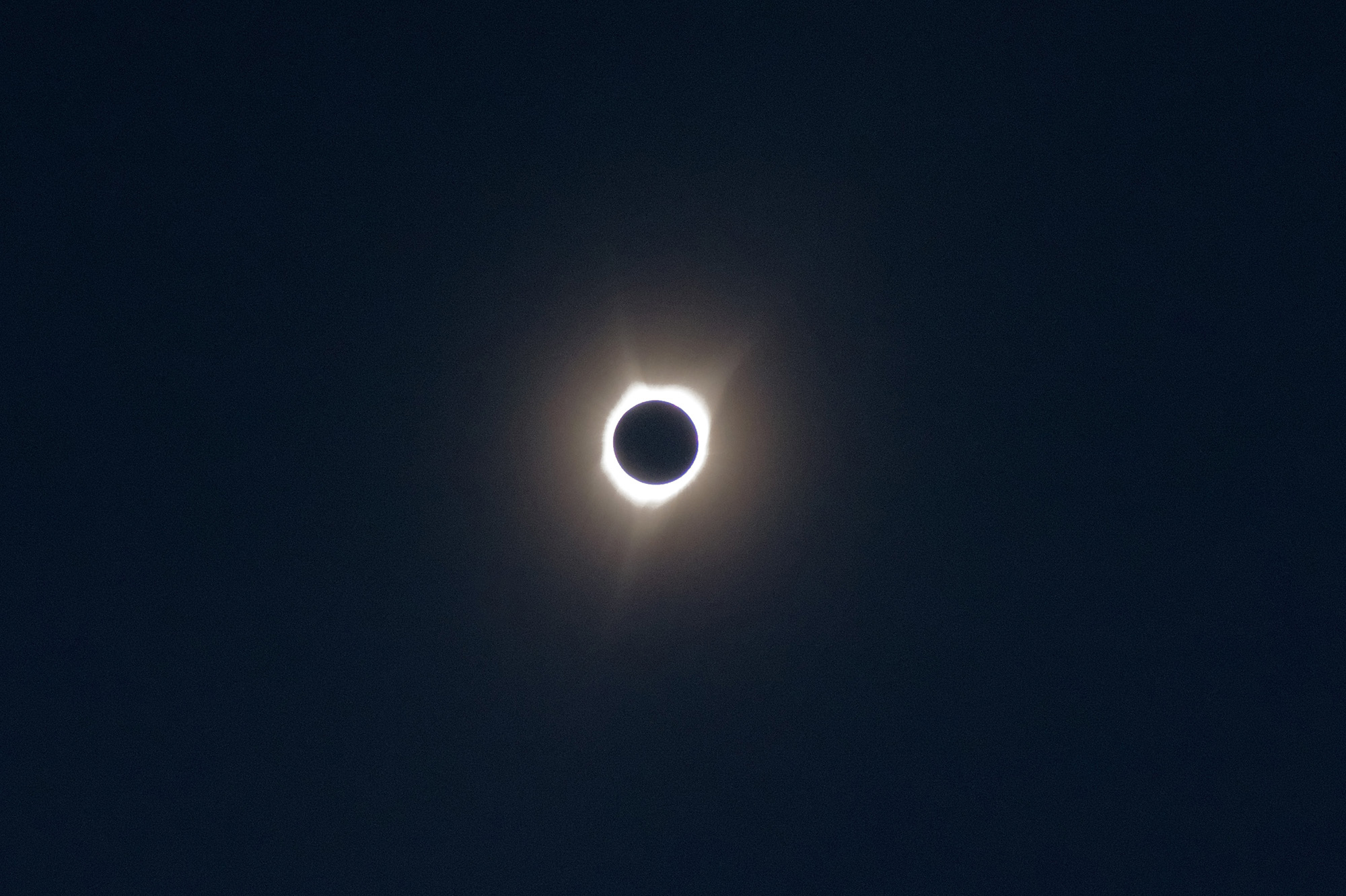 Nach einer kurzen, harten und auch kalten Nacht sind wir mit Hunderten anderen aus den Autos gekrochen, der Himmel zeigt kaum Bewölkung, die Stimmung ist hervorragend, Teleskope und Fotoapparate werden in Stellung gebracht, die Sonnenschutzbrillen werden probegetragen, alles ist bereit. Etwas Zeit um unsere Nachbarn zu studieren. Um 09:20 Uhr geht ein erster Aufschrei durch die Menge: der Mond schiebt sich von rechts oben langsam in die Sonne rein. Die Stunde vergeht zögerlich, es bleibt hell, auch wenn die Sonne nun zur Hälfte abgedeckt ist. Kann das sein? Es wird jedoch kühl und ein merkwürdiger Wind weht über die Ebene. Der Blick geht nun vermehrt gegen Westen, wo die Finsternis herkommen wird. 10.18 Uhr kommt der grosse Moment! Es wird Dunkel über uns, wie wenn ein grosses, grosses Raumschiff über uns schweben würde, denn am Rande der Ebene sind die Berge weiterhin taghell erleuchtet. Wir sind im totalen Mondschatten! Die Brille darf abgenommen werden und die für 2 Minuten vom Mond verdeckte Sonne ist nur noch an der Erhellung der Ränder des Mondes zu erkennen. Ja sogar Sterne und Planeten sind nun klar zu erkennen. Die Leute jubeln, einer fährt während der Finsternis mit aufgesetzter Brille sein Mountainbike („Never done that!!!), wir wissen nicht wohin schauen, wollen einfach nur den Moment geniessen und hoffen, dass er lange, lange dauert. Doch nach 2 Minuten und 5 Sekunden zieht der Mond weiter und direktes Sonnenlicht fällt wieder auf die unsere Köpfe. Das Licht bleibt allerdings vorerst noch einmalig gleichmässig. Der Spuk ist vorbei. Schade!